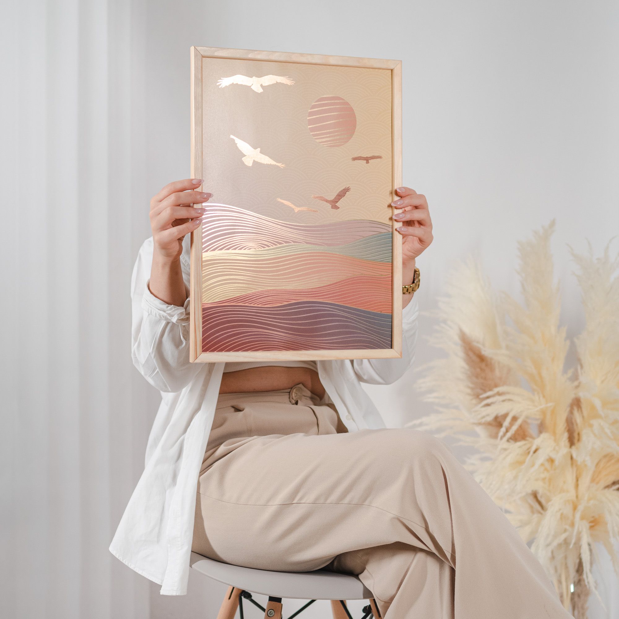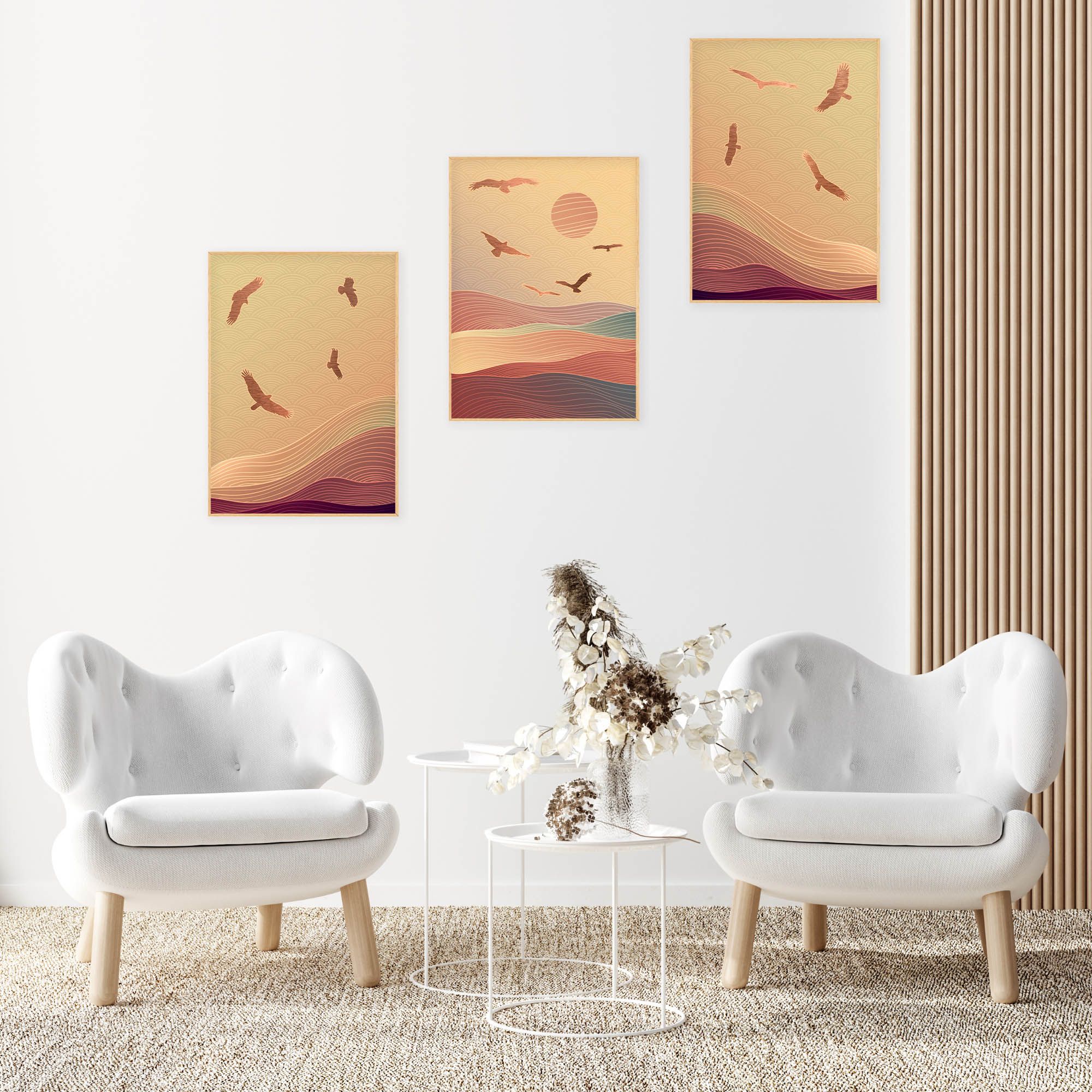 Il design moderno e accattivante si adatta a qualsiasi stile di arredamento e crea un’atmosfera piacevole in cui vivere e rilassarsi. Scegli i nostri poster con colori e soggetti che si adattano alle tue esigenze e preferenze, grazie alle particolari elaborazioni grafiche e artistiche che combinano colori e forme astratte di paesaggi nei arancioni con uccelli.