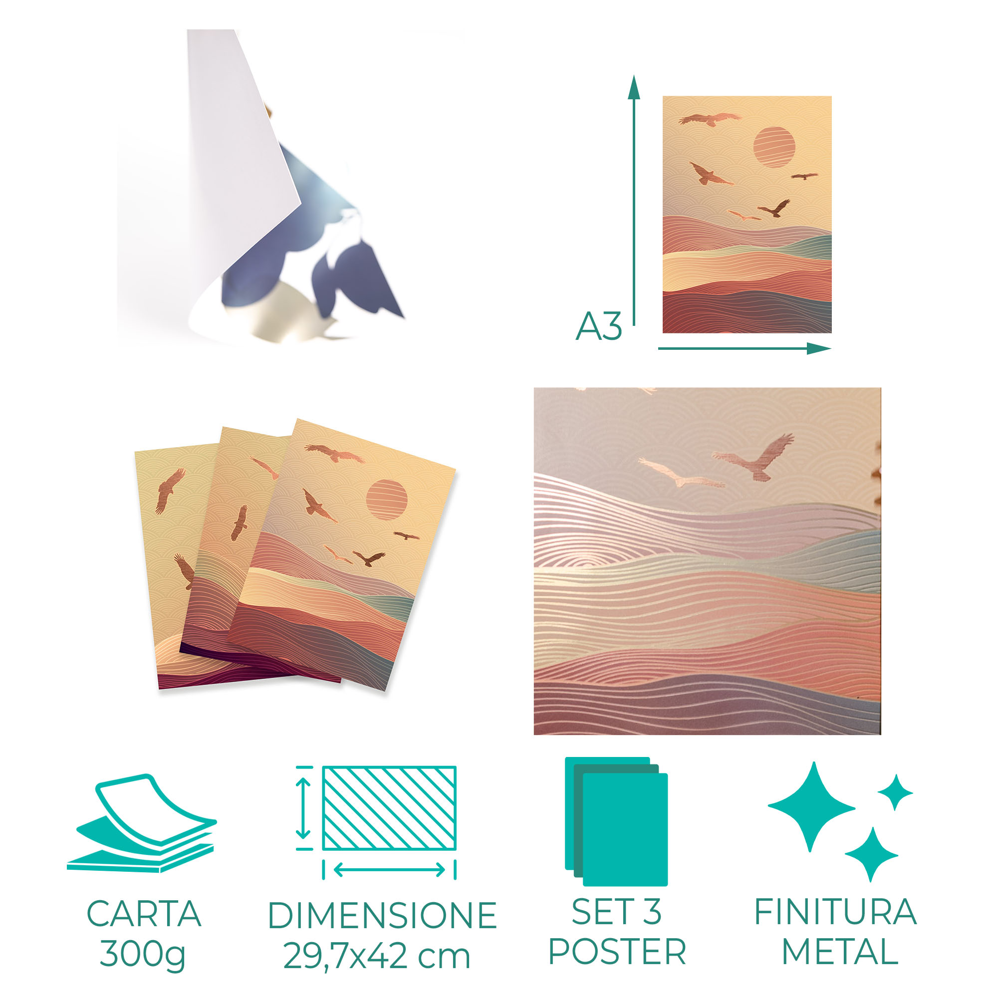 Stile e personalita’ alla tua casa con il nostro Set con 3 splendidi Poster da parete. Realizzati con materiali di alta qualita’ con carta 300 gr FSC stampata con inchiostri vivaci e caratterizzati da un effetto glamour pregiato Metalizzato con veri tratti dorati o argentati e finitura colorata, oro o argento, questi poster sono perfetti per decorare qualsiasi stanza della tua casa.