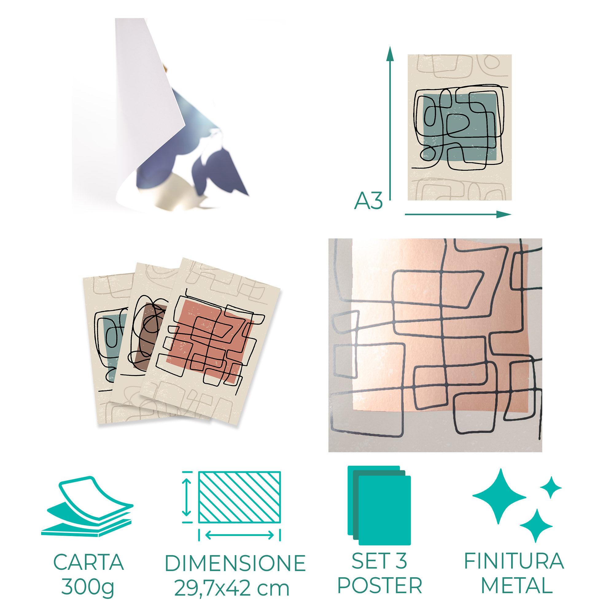 Stile e personalita’ alla tua casa con il nostro Set con 3 splendidi Poster da parete. Realizzati con materiali di alta qualita’ con carta 300 gr FSC stampata con inchiostri vivaci e caratterizzati da un effetto glamour pregiato Metalizzato con veri tratti dorati o argentati e finitura colorata, oro o argento, questi poster sono perfetti per decorare qualsiasi stanza della tua casa.