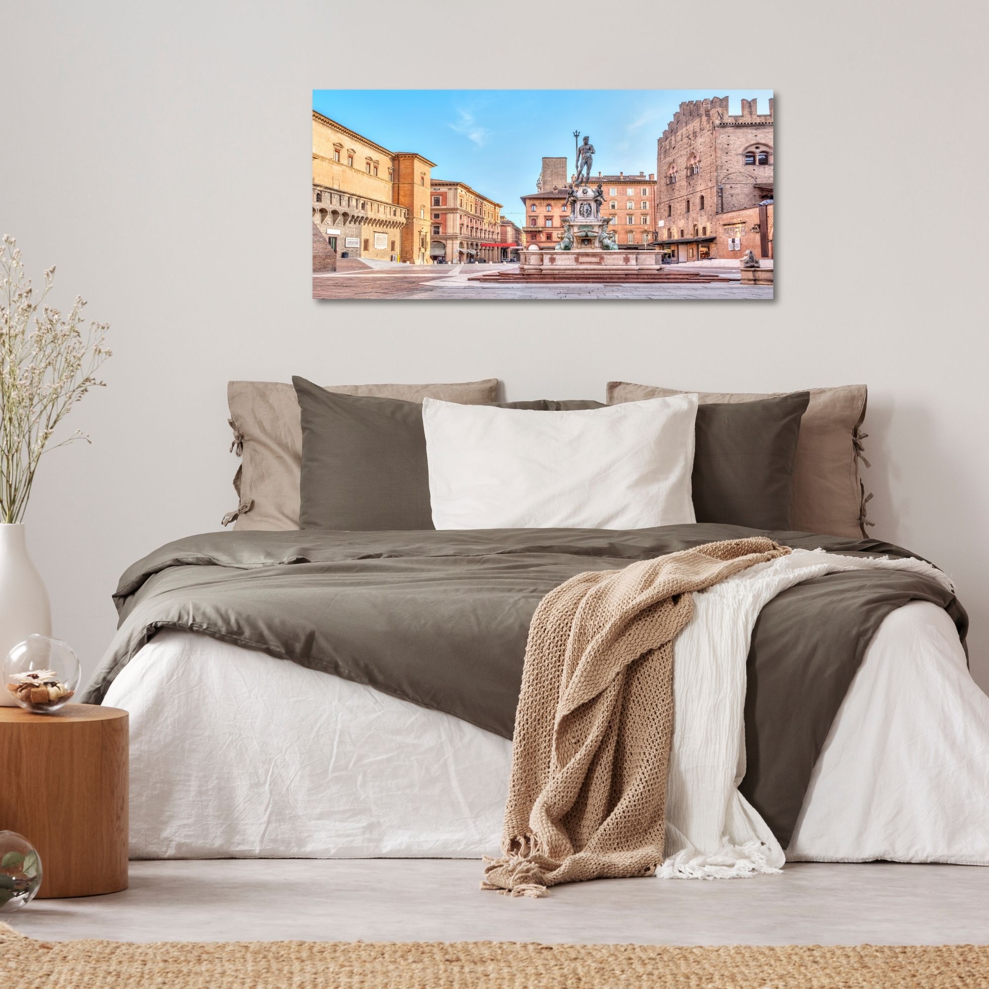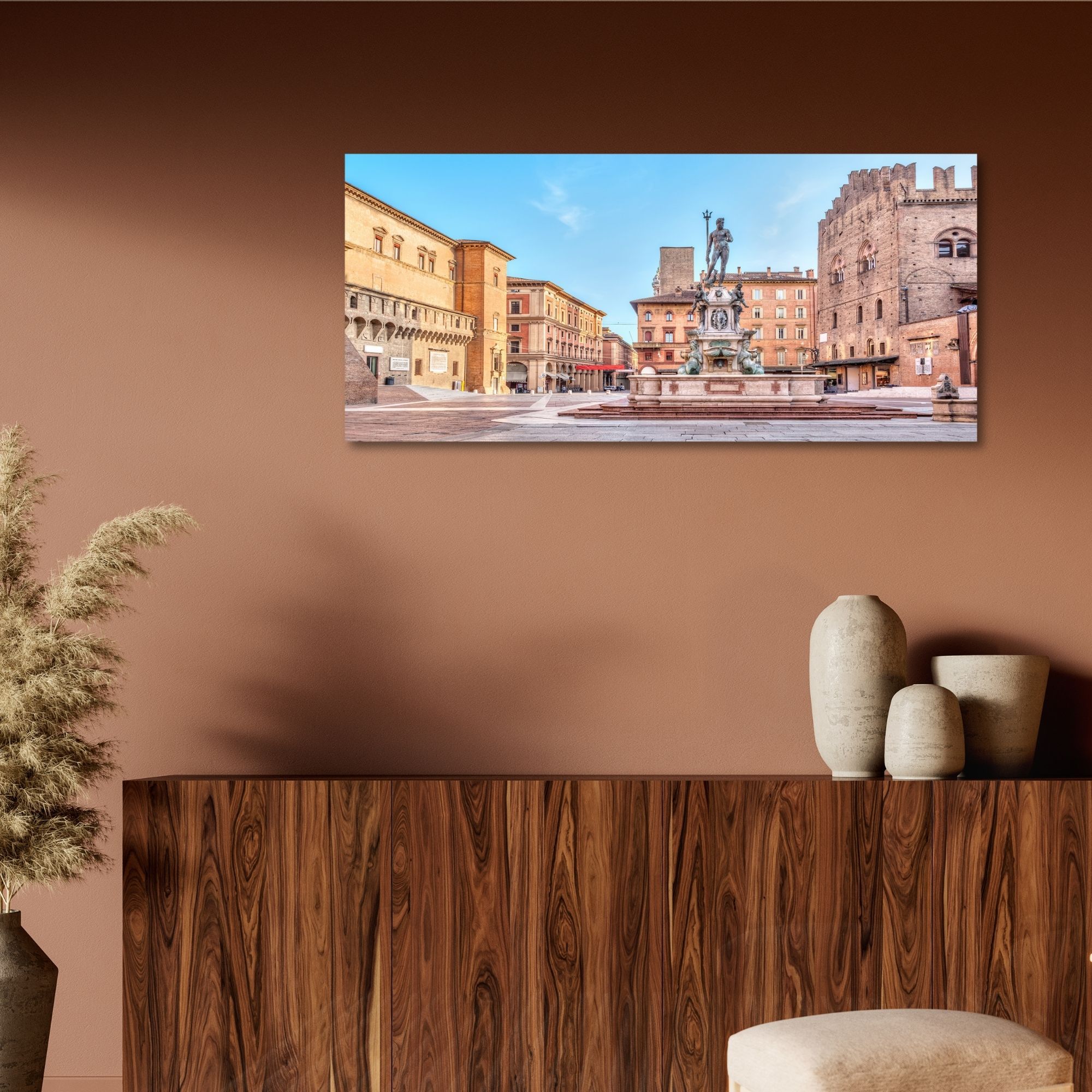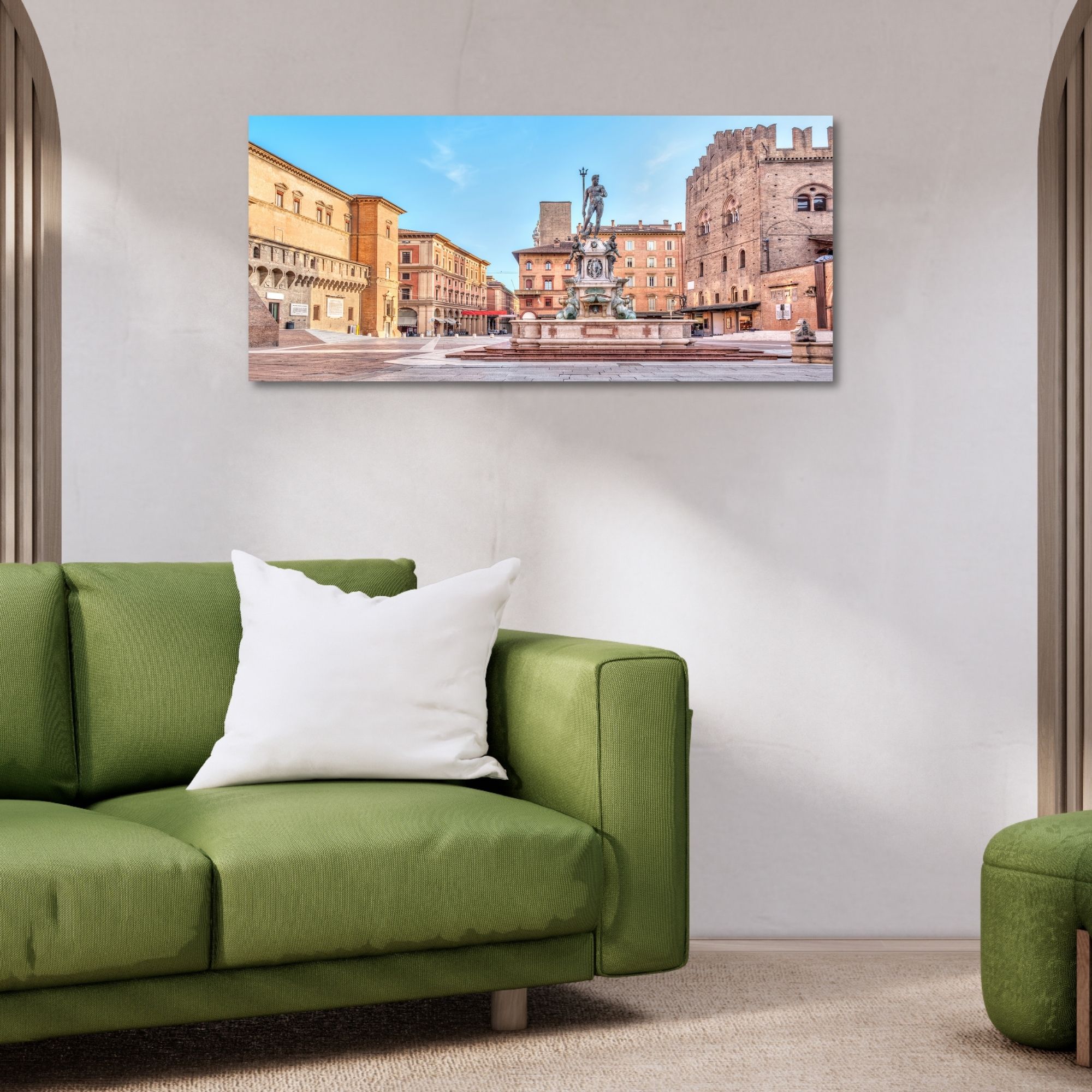Lupia - Quadro moderno su Tela Canvas DEEP 65X143 cm, con paesaggi e localismi italiani, per casa, soggiorno, capezzale camera da letto, hotel, ufficio, BOLOGNA - PIAZZA NETTUNO GIORNO -