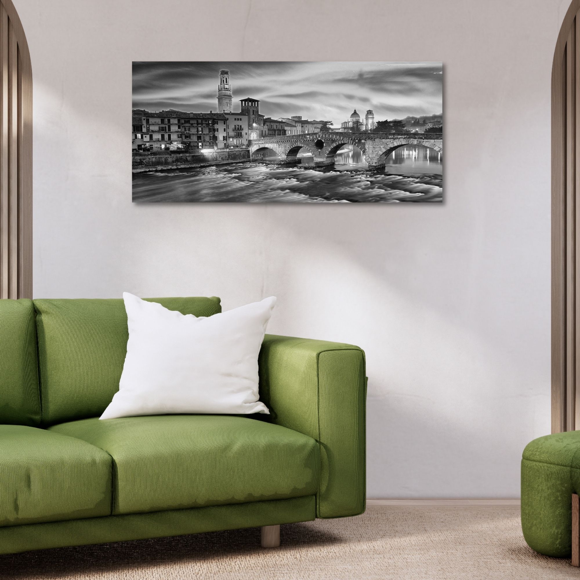 Lupia - Quadro moderno su Tela Canvas DEEP 65X143 cm, con paesaggi e localismi italiani, per casa, soggiorno, capezzale camera da letto, hotel, ufficio, VERONA - PONTE DI PIETRA BLACK -