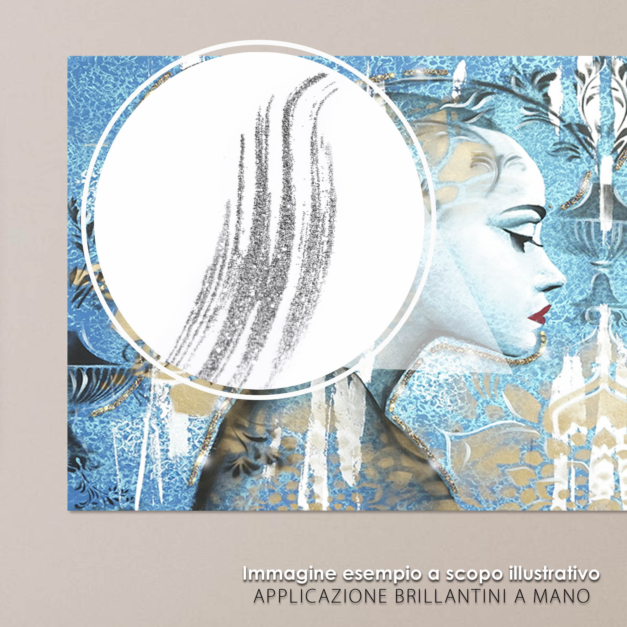La tela, un robusto poliestere, è impreziosita da brillantini e glitter argento che aggiungono un tocco di magia e vivacità, rendendo ogni visione un'esperienza unica. Il telaio, in fibra di legno ecologica spesso 1,6 cm, conferisce solidità all'opera, pronta per essere appesa senza sforzi e integrarsi armoniosamente in qualsiasi ambiente.
