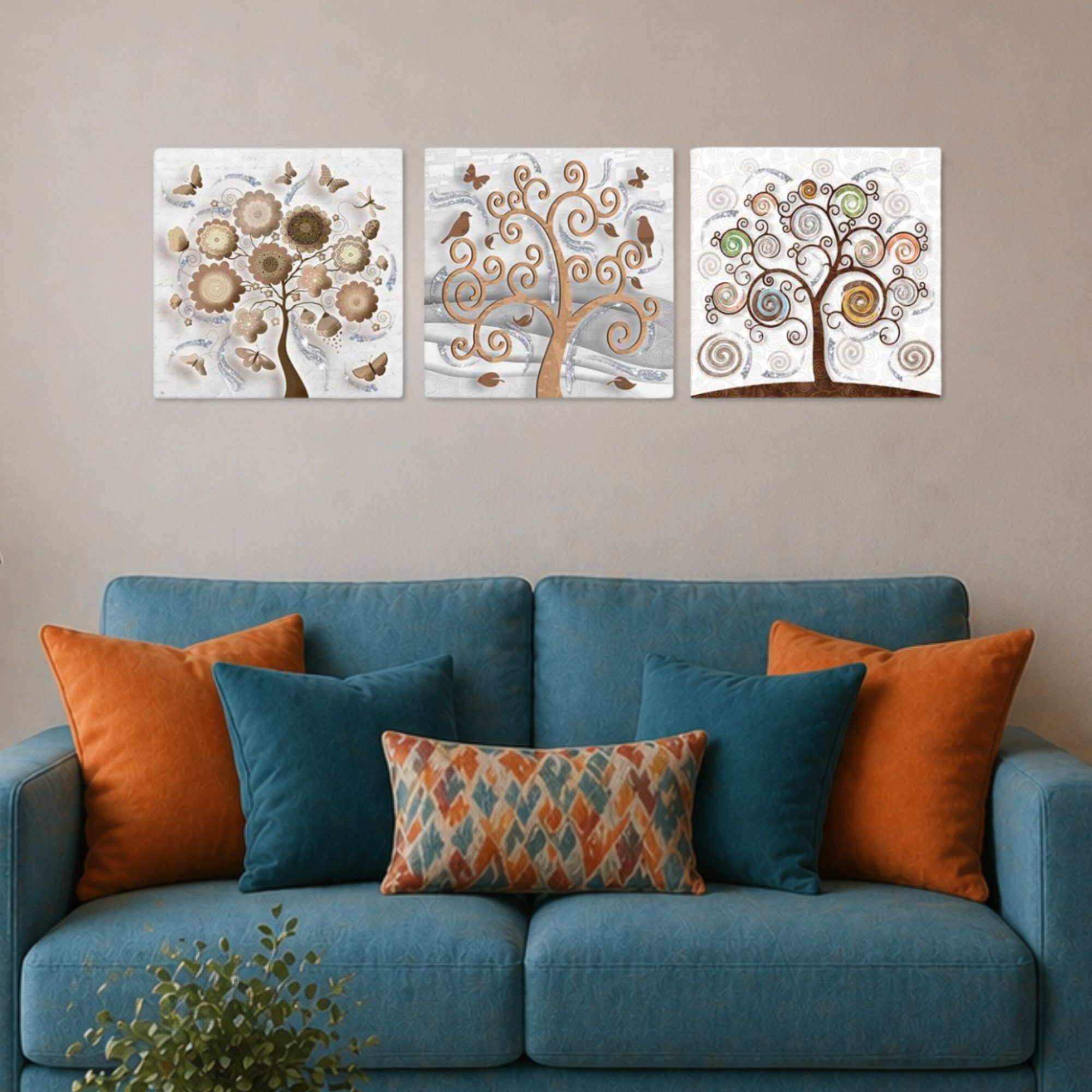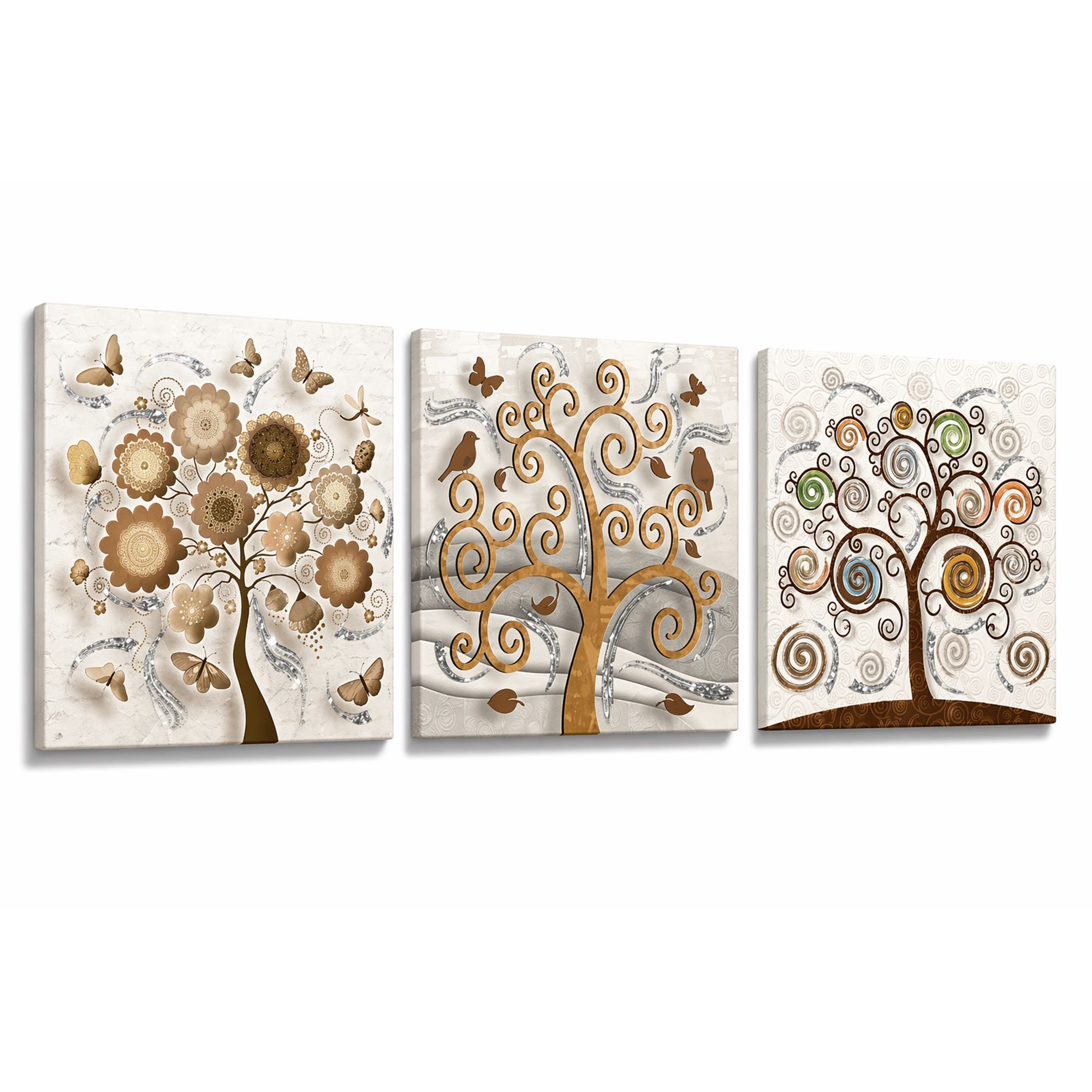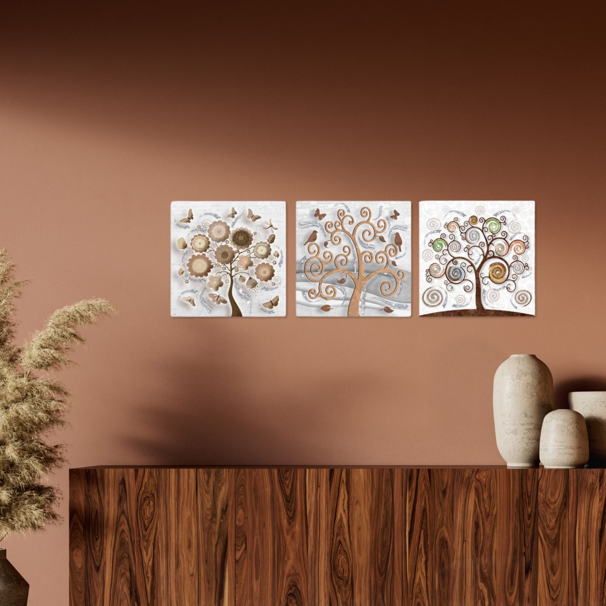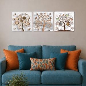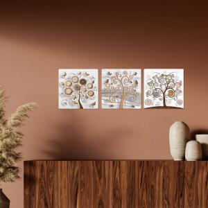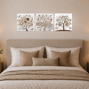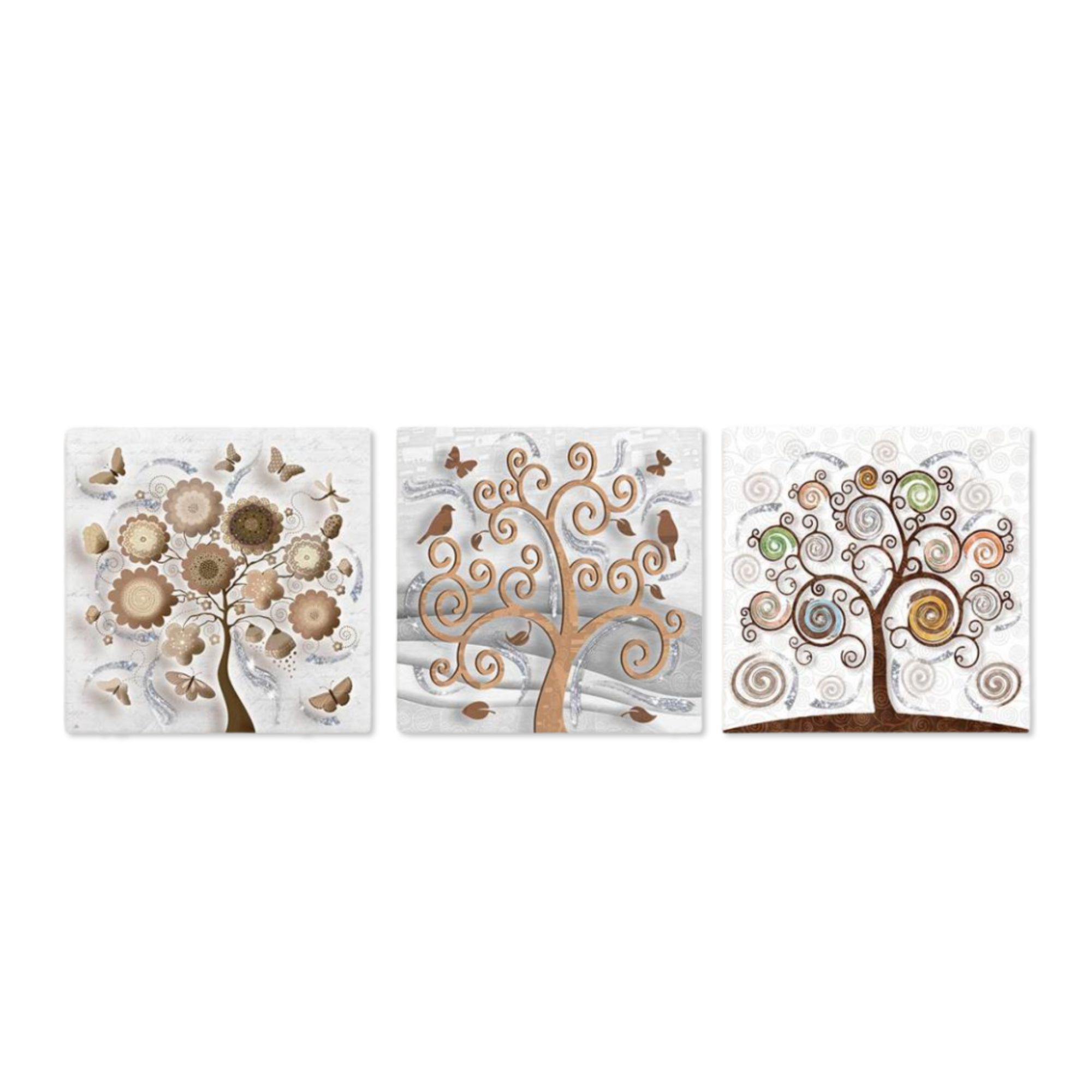 Il nostro Set composto da 3 Quadri su tela moderni offre 3 pezzi separati nelle dimensioni 38x38 cm ciascuno, caratterizzati da stampe con colori profondi e vividi. Una nuova ed originale decorazione con il tema albero della vita che nobilita e rende piacevole il tuo arredo con brillantini GLITTER. Ogni quadro è pronto da appendere con telaio in legno e tela pvc con spessore di 12mm, già montato, puoi appendere i 3 quadri come preferisci e nell'ordine che più ti piace per decorare la tua parete al meglio. Abbellisci la testa del tuo letto matrimoniale, la parete dietro al tuo divano o cucina, corridoio, ufficio, ingresso, bagno e dai spazio alla tua creativita'. Realizzato completamente in Italia.