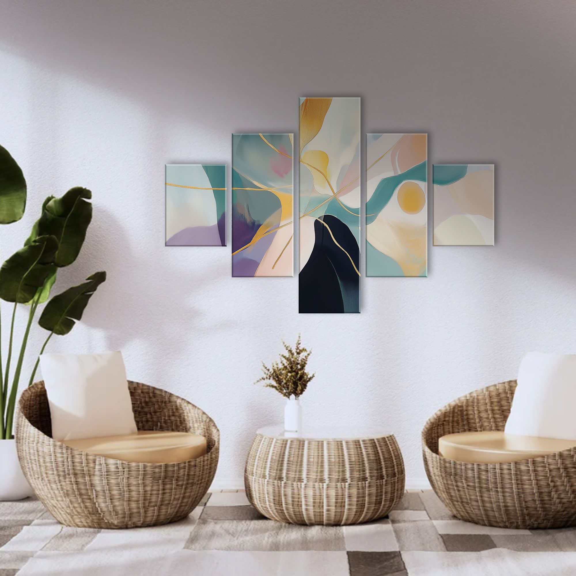 Scopri l'eleganza del Quadro Moderno 5 Pezzi in Legno Vogue 66X115 cm di Lupia. Questo capolavoro artistico e' composto da cinque pannelli in legno ecologico, per formare un'unica immagine mozzafiato. Con un design moderno e sofisticato, questo quadro e' ideale per arricchire qualsiasi ambiente, dal soggiorno alla camera da letto, fino a spazi commerciali come uffici e hotel.