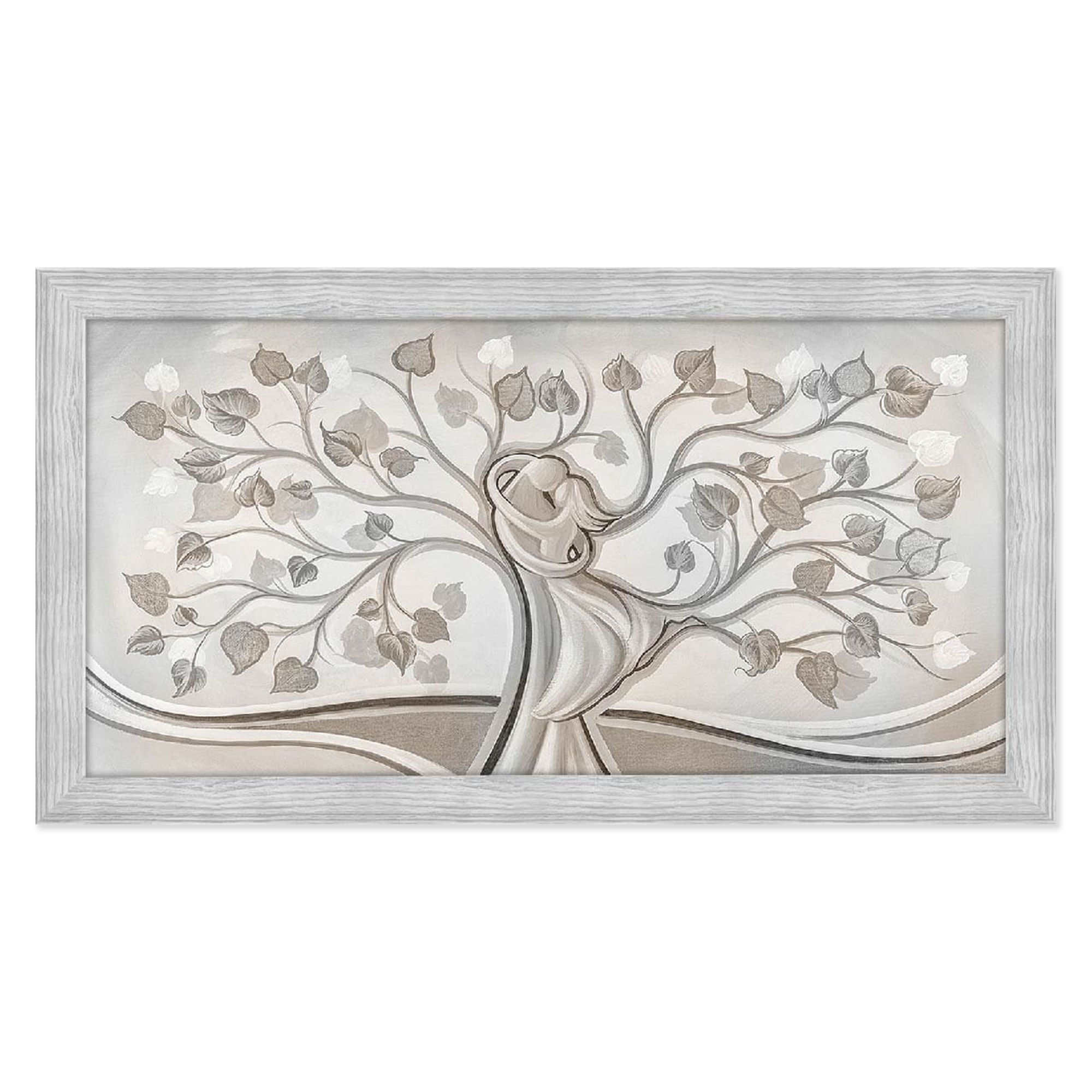 La stampa raffigura un abbraccio tra due innamorati che prende vita, diramandosi verso l’alto e intrecciandosi con l’albero della vita. Questo soggetto non è solo un elemento decorativo, ma un simbolo di affetto, unione e armonia. È capace di