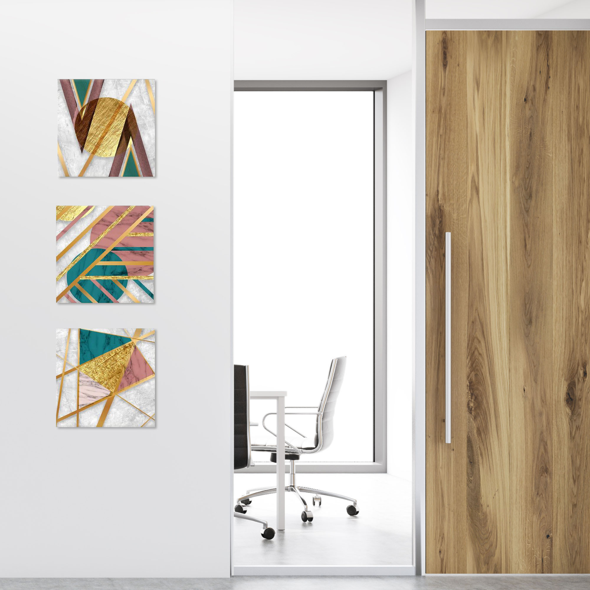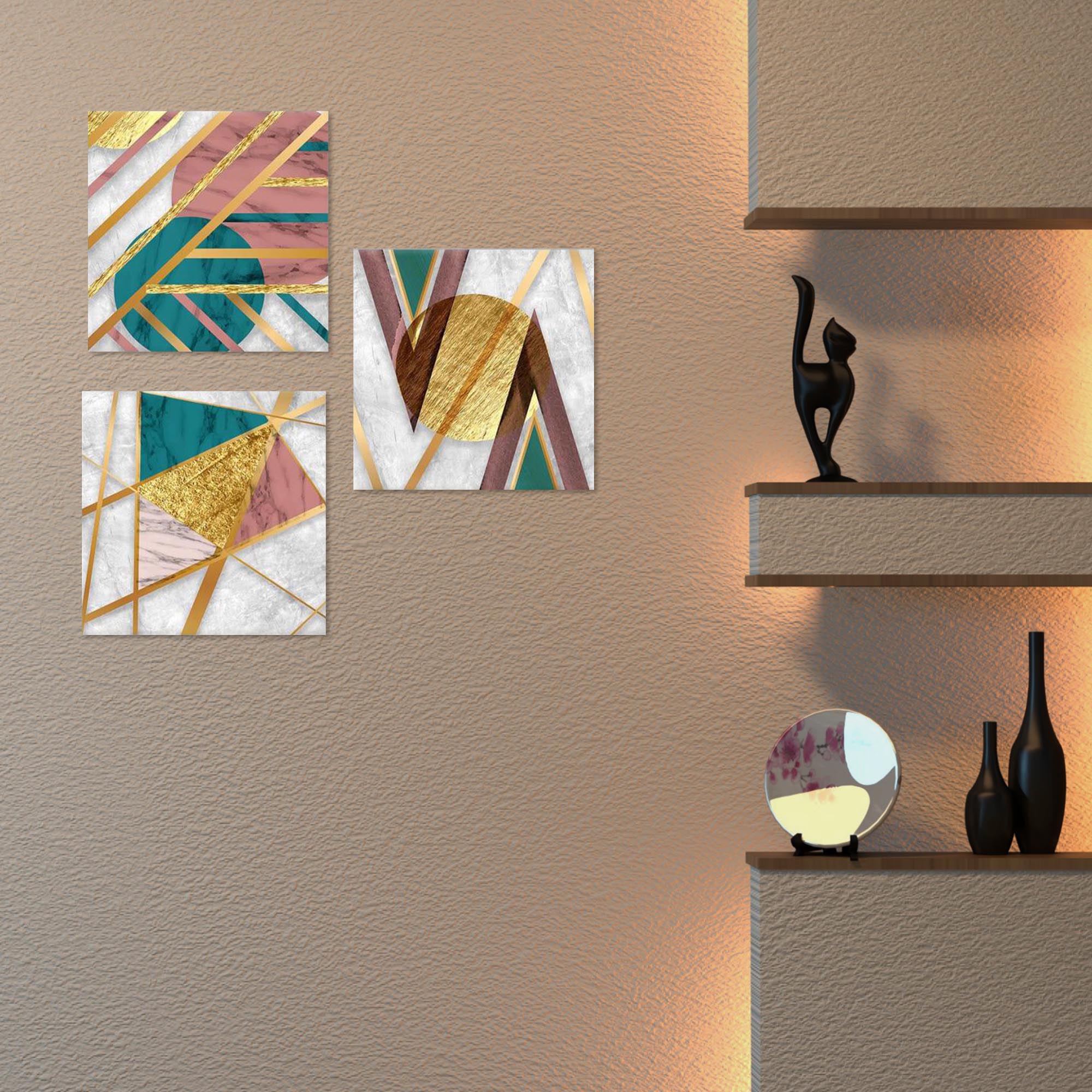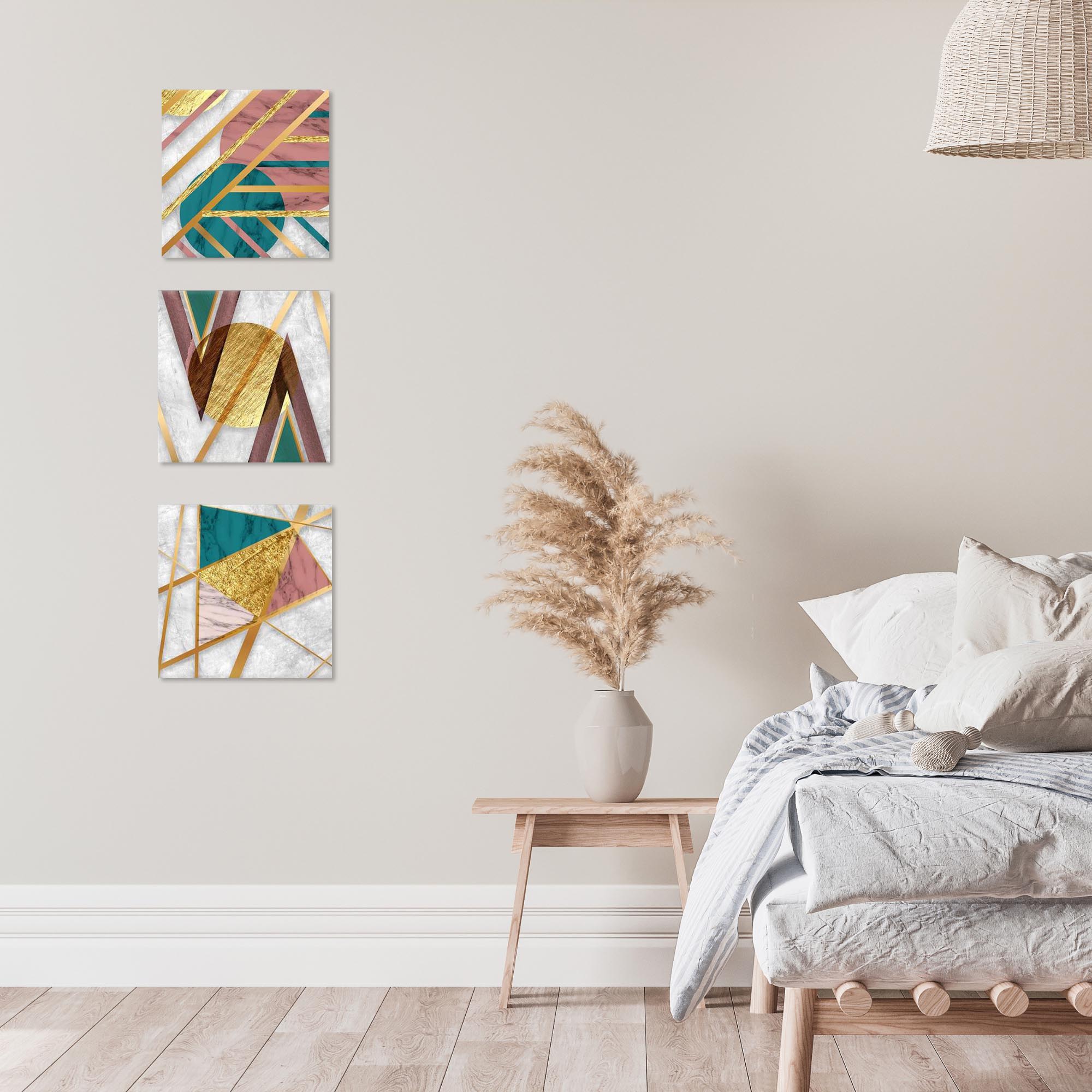 Una nuova ed originale decorazione che nobilita e rende piacevole il tuo arredo con il tema gemoetrico astratto nei toni del verde, del rosa e dell'oro. Ogni quadro è pronto da appendere con telaio in legno ecologico gia' montato e tela in poliestere con spessore di 12 mm, puoi appendere i 3 quadri come preferisci e nell'ordine che più ti piace per creare la tua parete artistica.