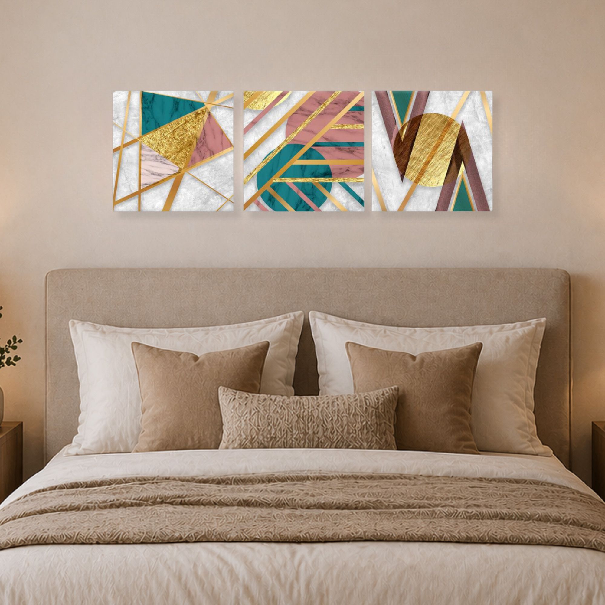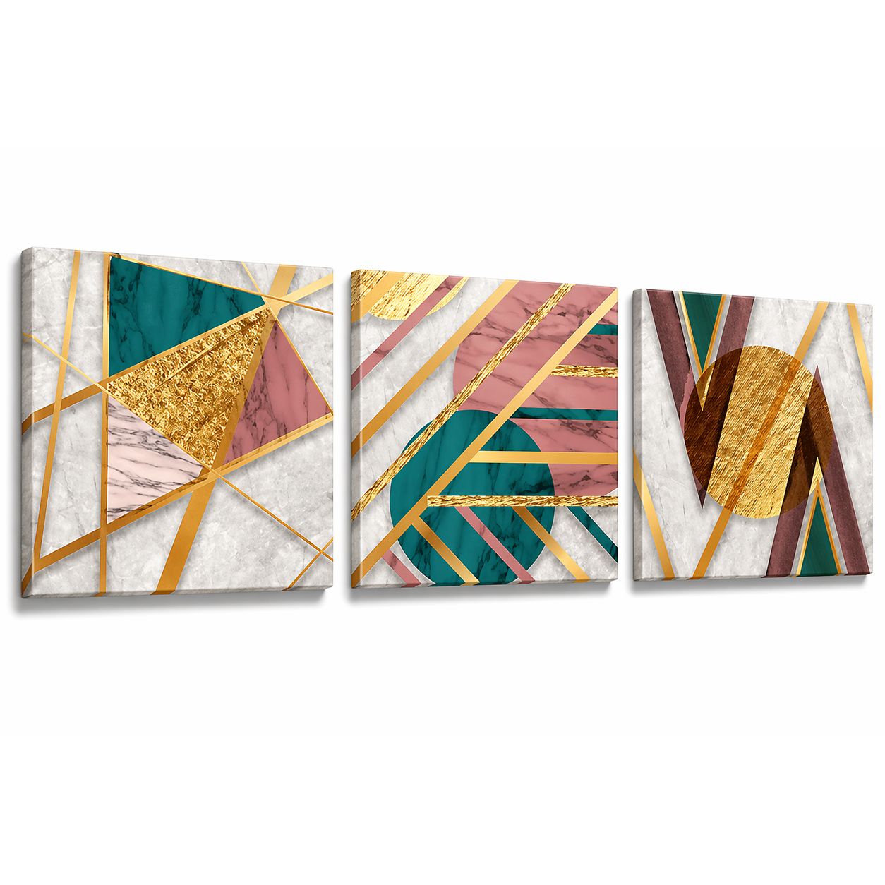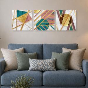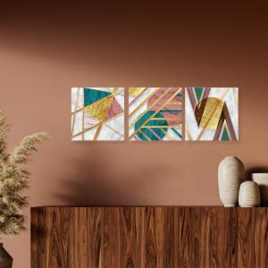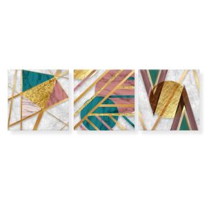 Una nuova ed originale decorazione che nobilita e rende piacevole il tuo arredo con il tema gemoetrico astratto nei toni del verde, del rosa e dell'oro. Ogni quadro è pronto da appendere con telaio in legno ecologico gia' montato e tela in poliestere con spessore di 12 mm, puoi appendere i 3 quadri come preferisci e nell'ordine che più ti piace per creare la tua parete artistica.