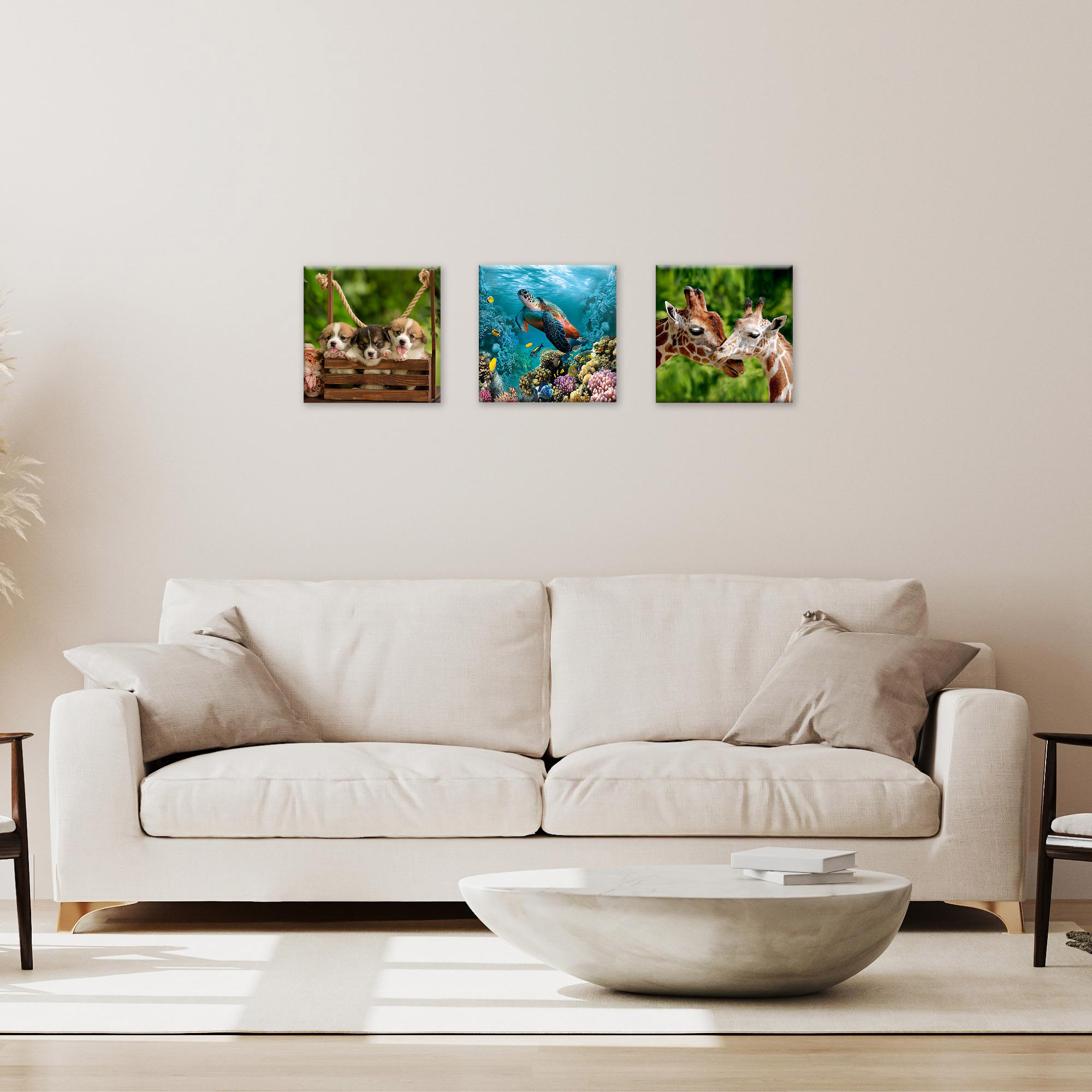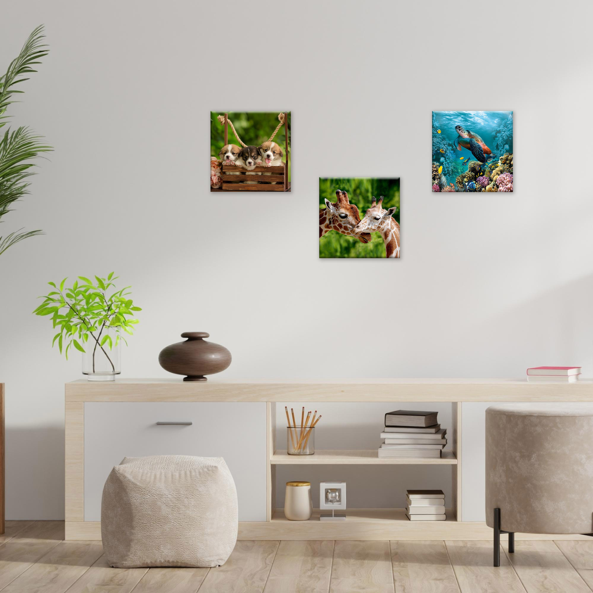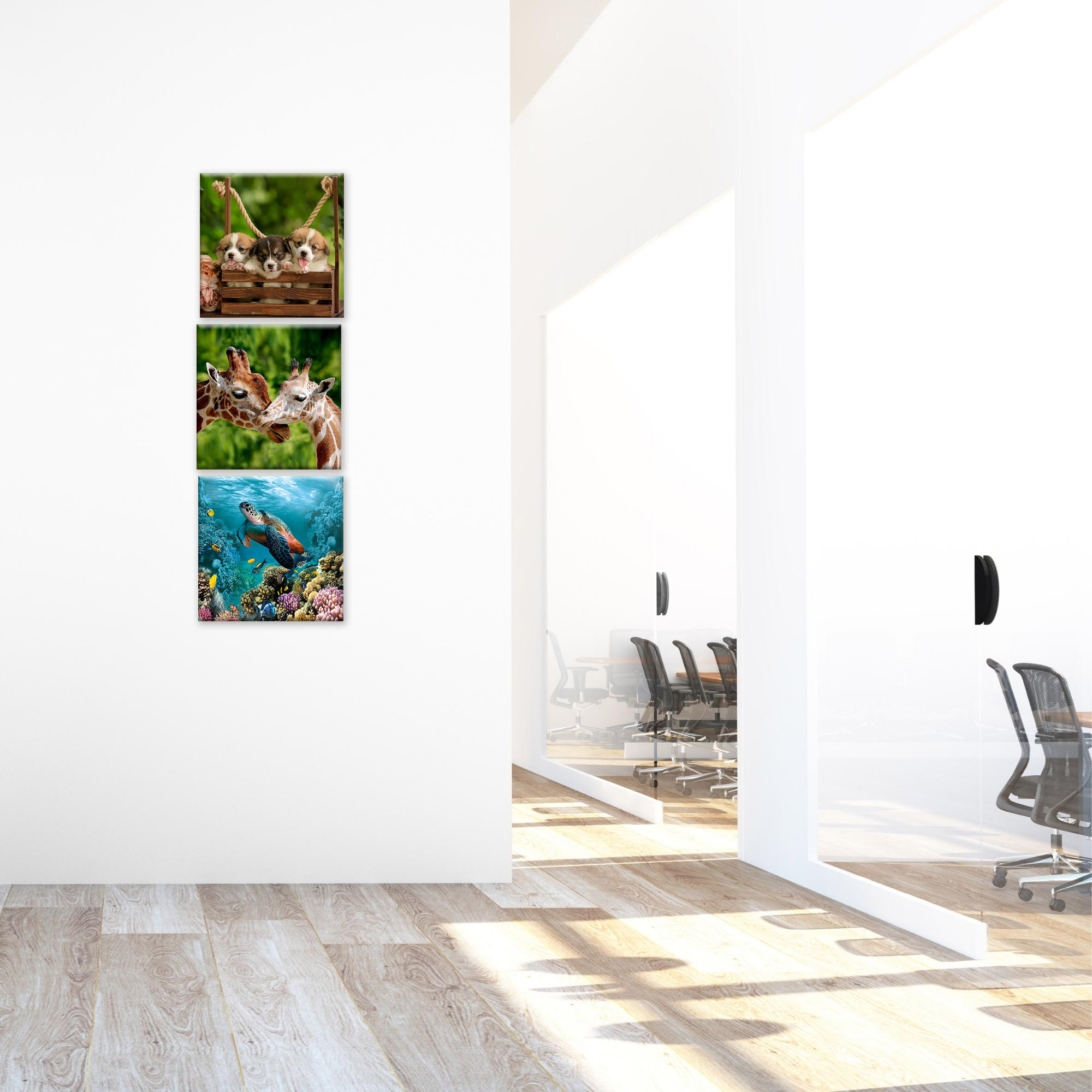 Il nostro Set composto da 3 Quadri su tela pvc moderni offre 3 pezzi separati nelle dimensioni 38x38 cm ciascuno, caratterizzati da stampe con colori profondi e vividi. Una nuova ed originale decorazione che nobilita e rende piacevole il tuo arredo con il tema naturale degli animali. Ogni quadro è pronto da appendere con telaio in legno e tela pvc con spessore di 12mm, già montato, puoi appendere i 3 quadri come preferisci e nell'ordine che più ti piace per decorare la tua parete al meglio. Abbellisci la testa del tuo letto matrimoniale, la parete dietro al tuo divano o cucina, corridoio, ufficio, ingresso, bagno e dai spazio alla tua creativita'. Realizzato completamente in Italia.
