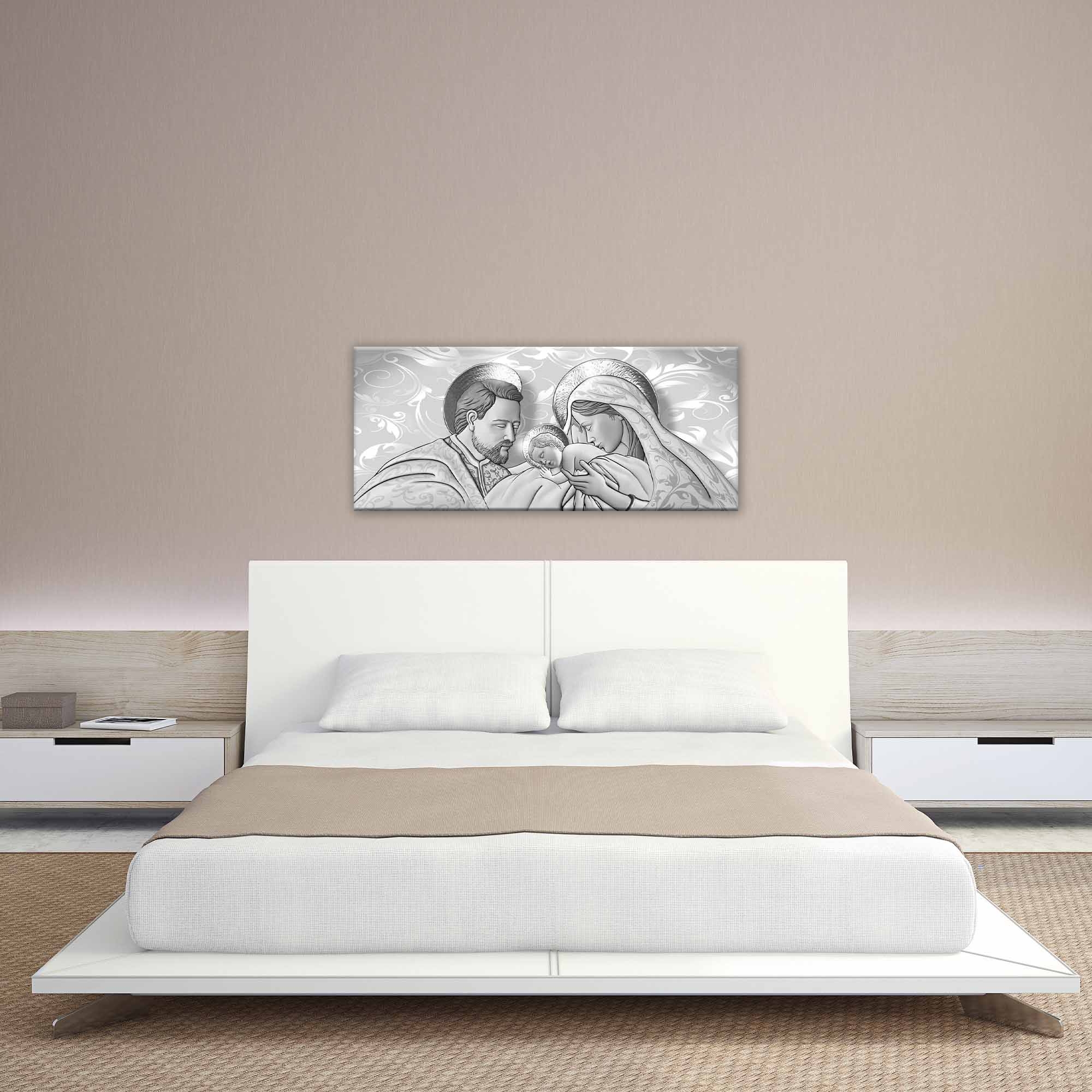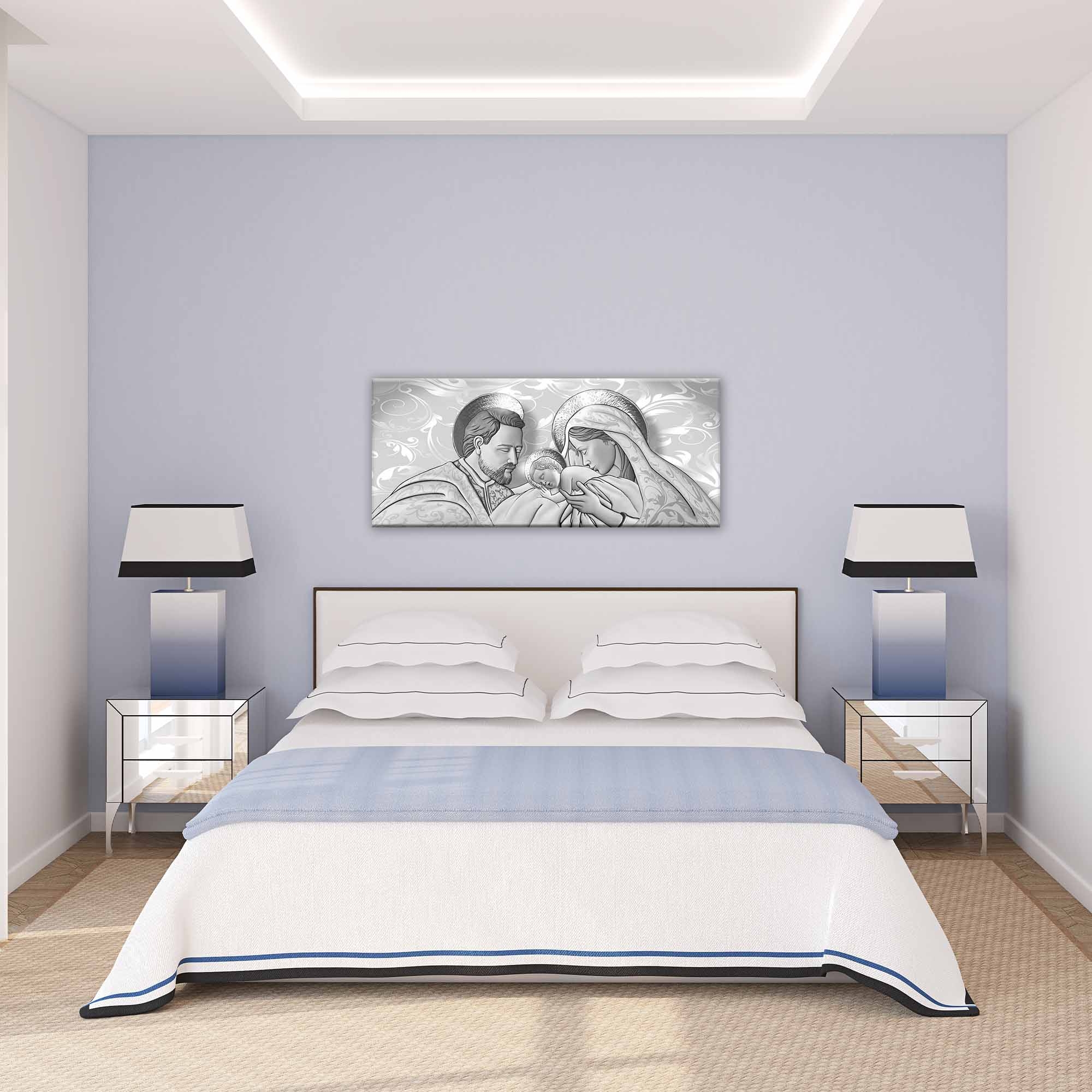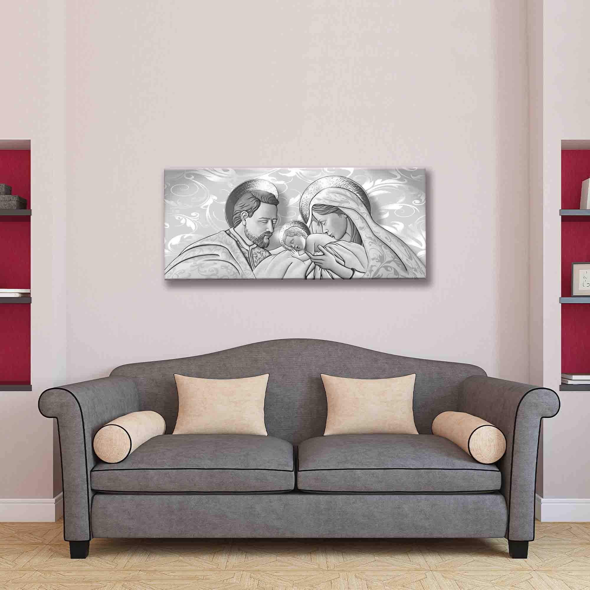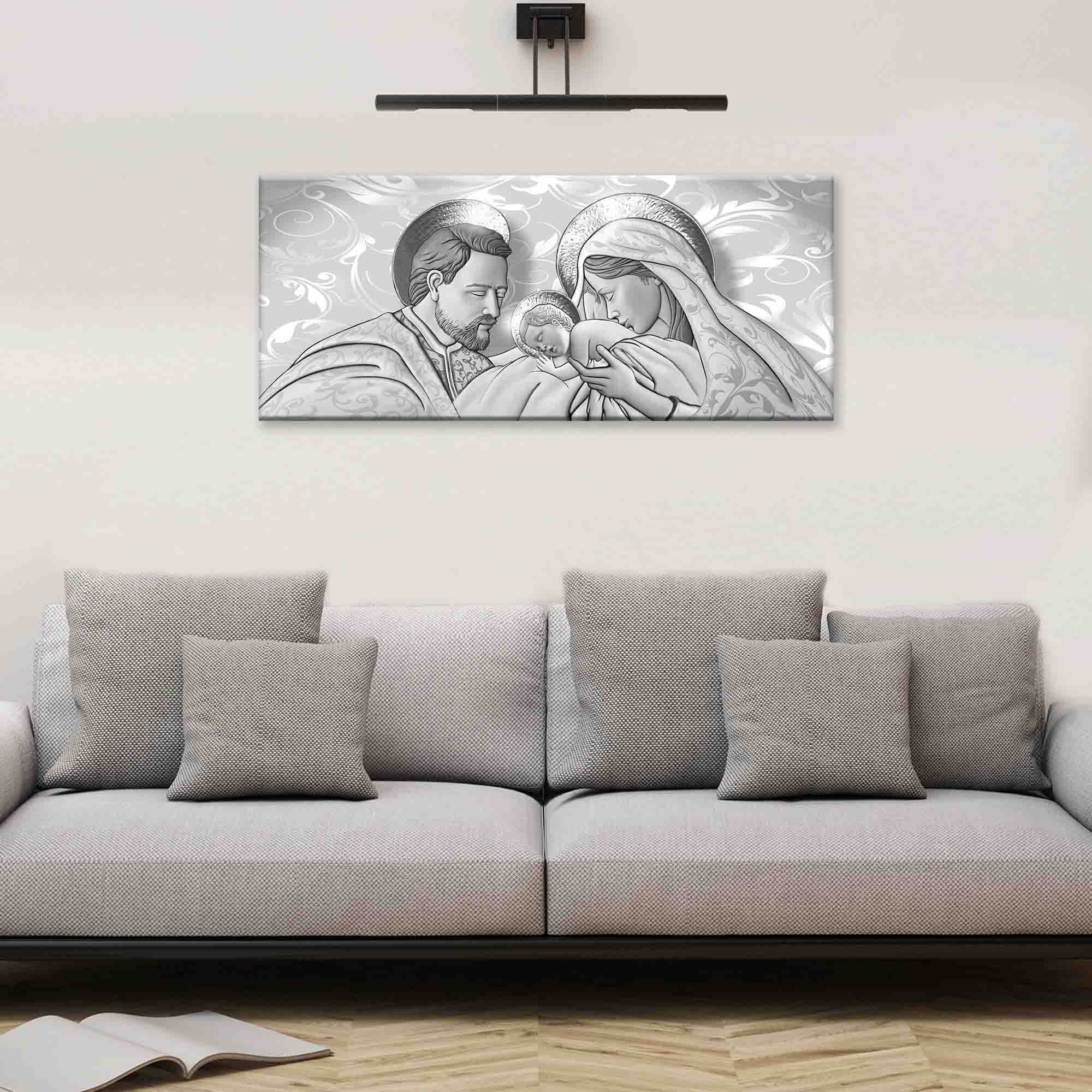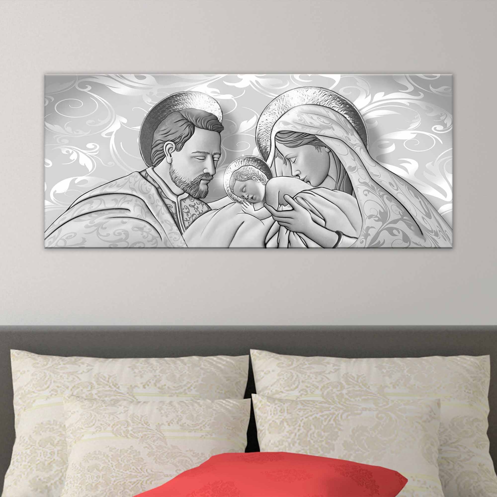 Il nostro Quadro Moderno Canvas World, presenta una stampa su tela PVC di alta qualità, in legno ecologico. Il fulcro dell’opera è un dolce bacio familiare tra madre e figlio, avvolti in un’atmosfera sacra. Il tutto è messo in risalto da colori vivaci e vibranti con dettagli argento, che donano un'interpretazione artistica della Sacra Famiglia.