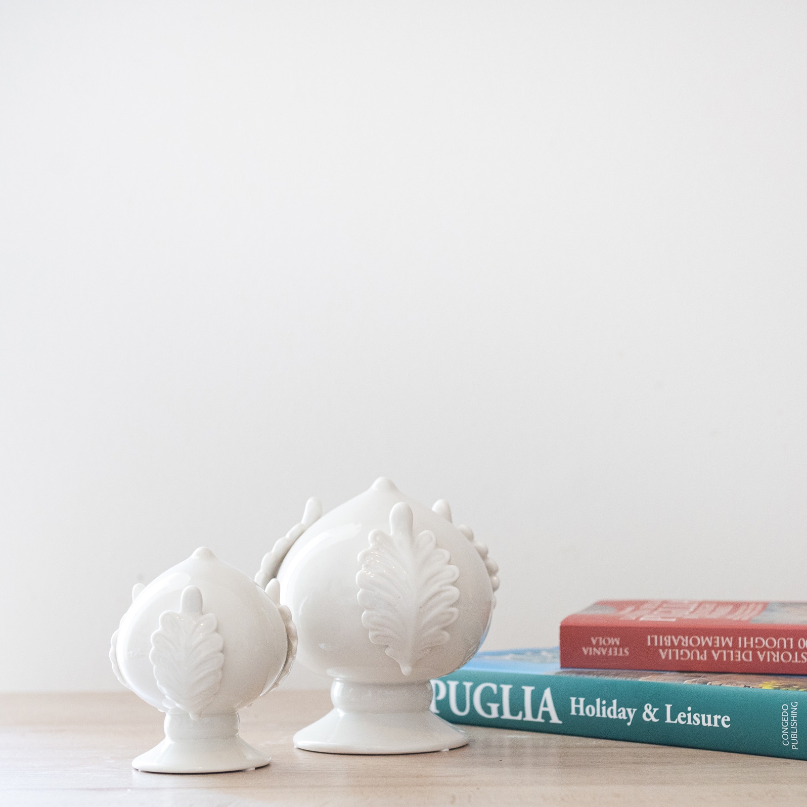 Pumo Salentino in ceramica chiuso nella colorazione artigianale Bianca, un decoro tipico pugliese che ha origini antiche nel Salento. Oggetto decorativo con 3 foglie sui lati, con decorazione in ceramica. Perfetto come soprammobile o da utilizzare come bomboniera per matrimoni, cresime, comunioni, battesimi, laurea, eventi o ricevimenti. Il Pumo Rappresenta un bocciolo del fiore di acanto come simbolo di prosperità, forza e fecondità, donato come buon auspicio e per arredarele il soggiorno, l'ingresso, cucina, camera da letto o bagno, camino, tavoli, mensole o librerie o metterlo in balcone, giardino o veranda. Articolo disponibile nelle misure: