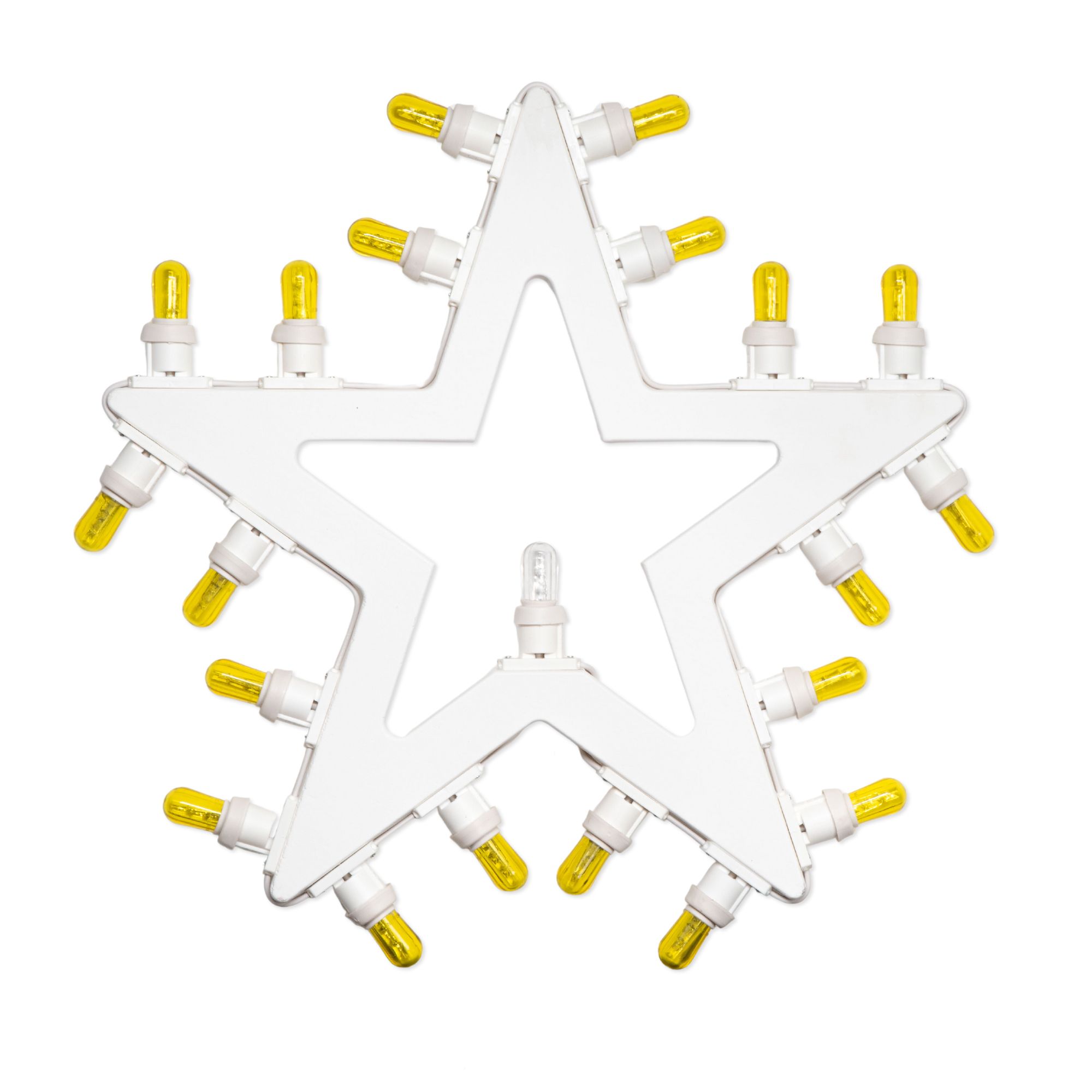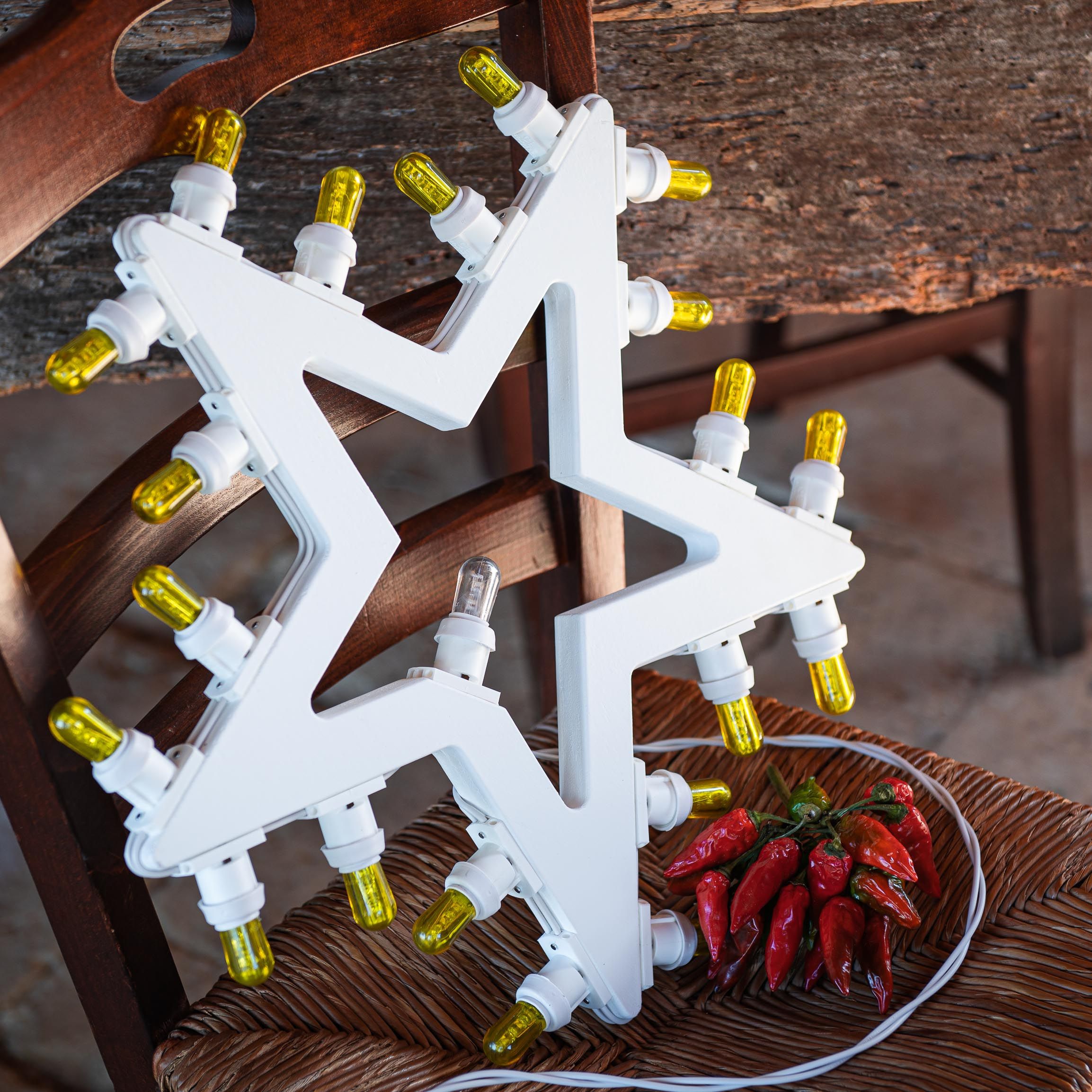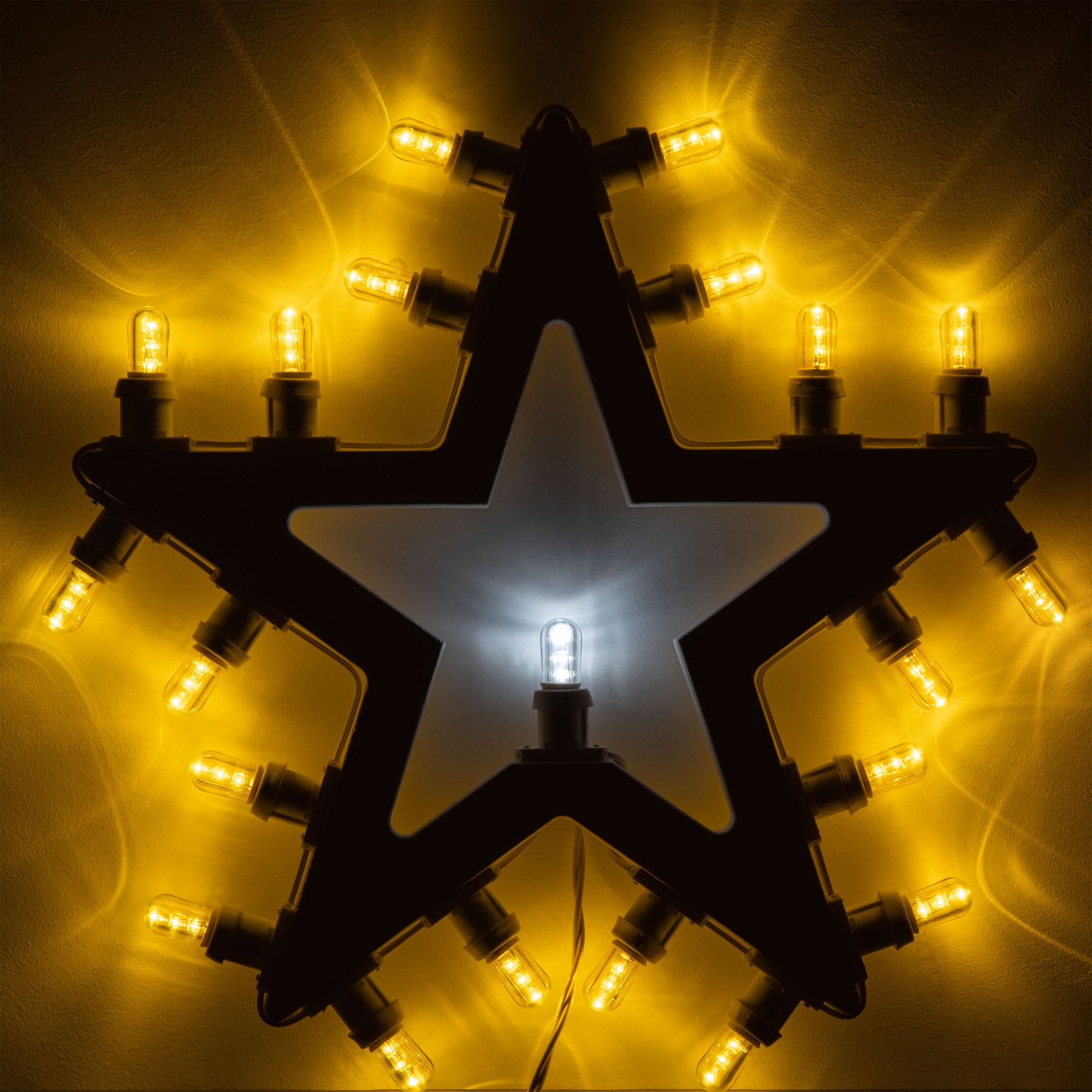 Si compone di 20 lampadine a led ecologiche gialle posizionate tutt’intorno la forma a stella, ed una bianca trasparente al centro.
