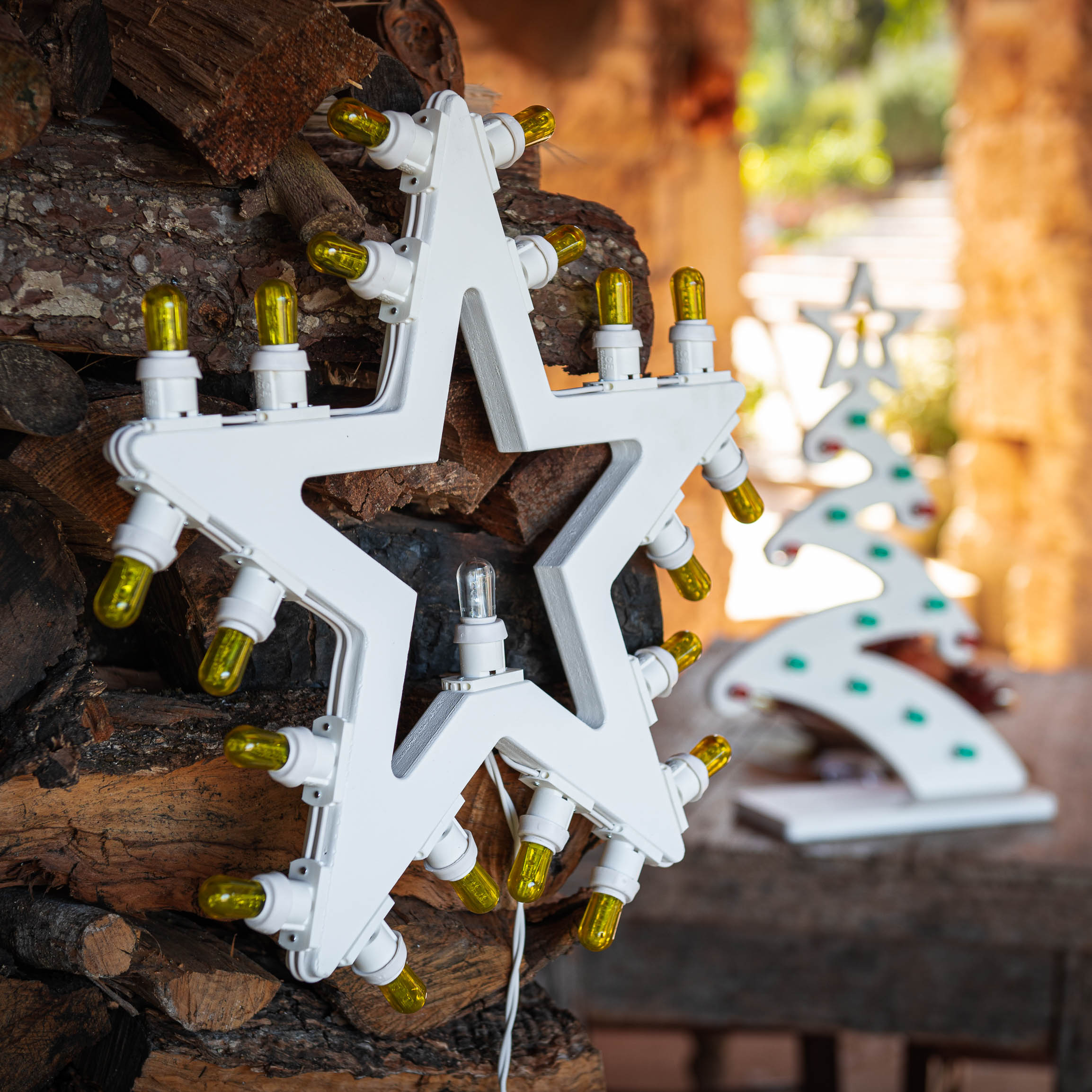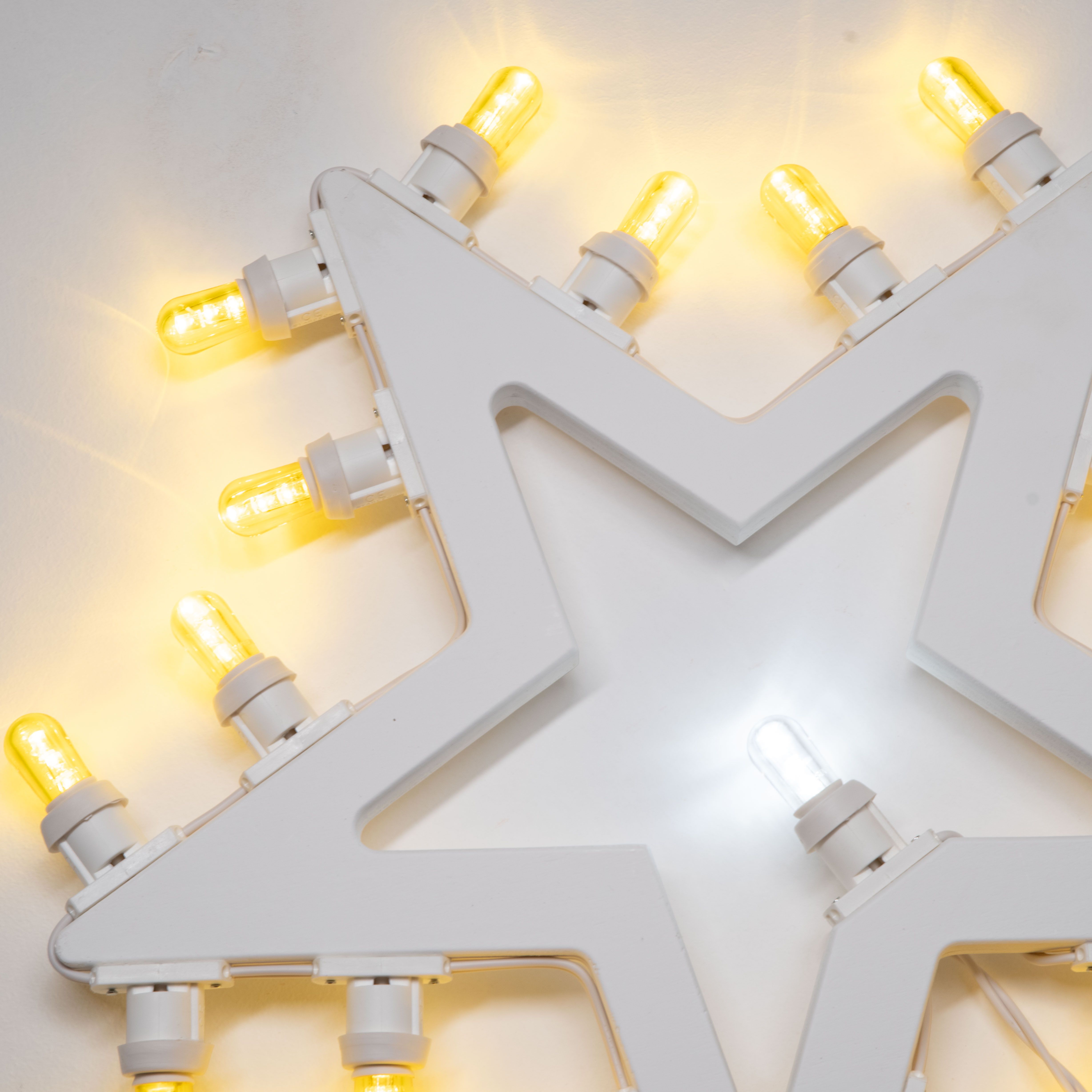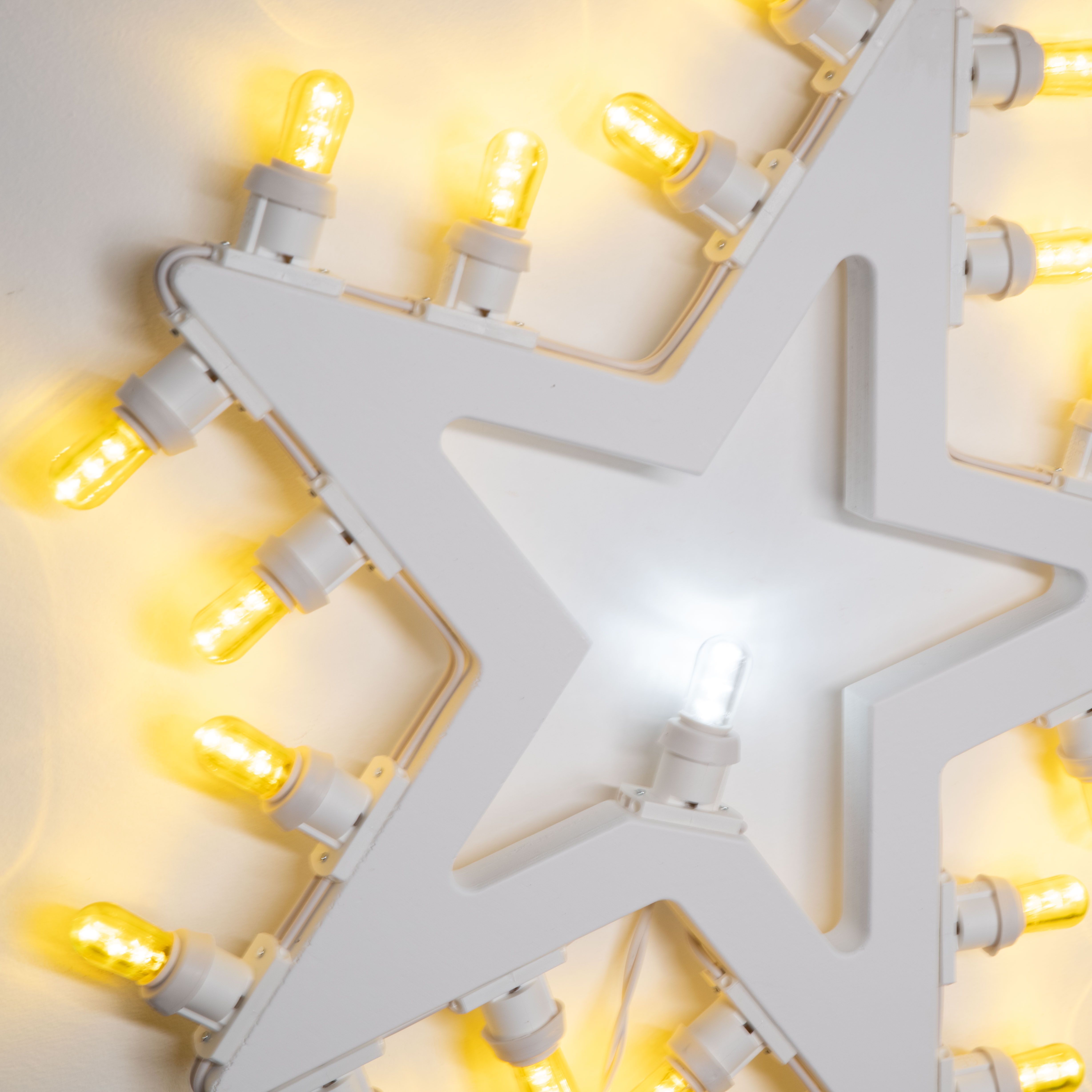 Si compone di 20 lampadine a led ecologiche gialle posizionate tutt’intorno la forma a stella, ed una bianca trasparente al centro.