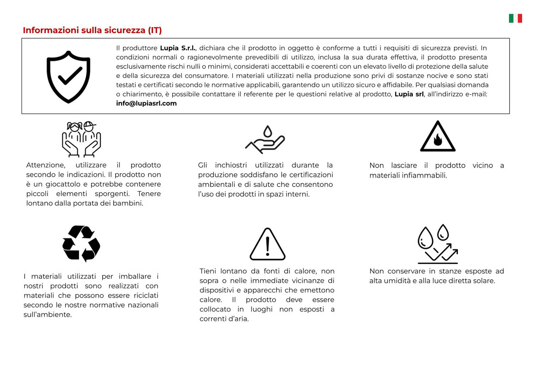 Vorreishop si impegna, per ogni prodotto venduto, a offrire schede di sicurezza e manuali utente dettagliati, nel pieno rispetto della normativa europea GPSR, garantendo che tutti i prodotti siano conformi agli standard di sicurezza richiesti. Puoi accedere e scaricare le immagini di sicurezza e il manuale utente nella sezione dedicata "Risorse per la sicurezza" presente su questa pagina. Per maggiori informazioni visita Condizioni Generali di Vendita