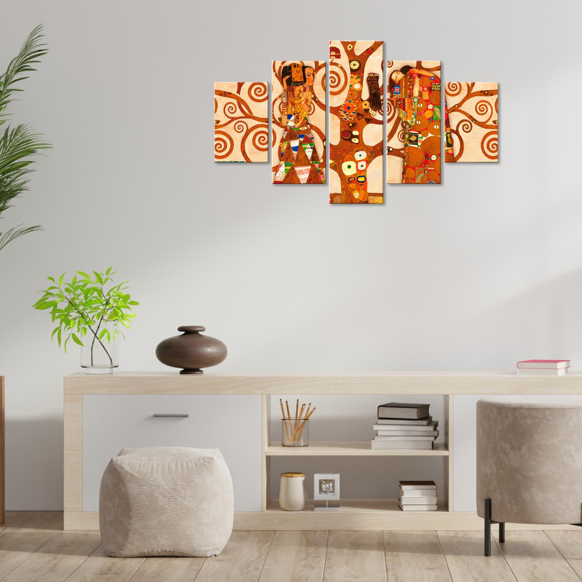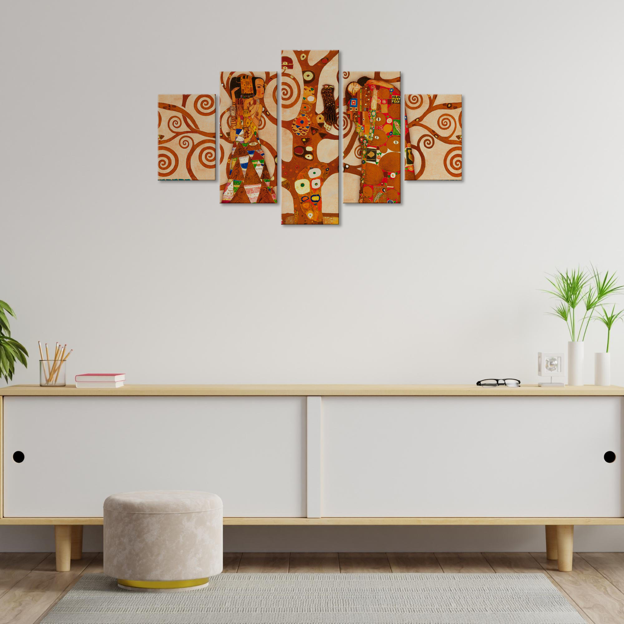 I nostri VOGUE sono stampe artistiche digitali ad alta risoluzione montate su pannello in fibra di legno ecologico. 5 pannelli, pronti per essere appesi, un’idea originale per decorare con il tema albero della vita le pareti della tua casa come soggiorno, camera da letto, in cucina, bagno, sale da pranzo, o di tutti i tuoi ambienti anche non domestici, come ufficio, Hotel, bar, negozio o laboratorio, perché sono adatte a qualsiasi tipologia di stile e arredamento. Il prodotto è realizzato con stampe di alta qualità originali e per tutti i gusti. La produzione è artigianale ed è al 100% Made in Italy. Si fissano tramite biadesivo, fornito nella confezione, su tutte le superfici. Si presenta in 5 pezzi che formano l’immagine completa, 5 pannelli divisi per una dimensione totale di 66x115 cm, dove 66 cm è l'altezza e 115 cm la lunghezza totale della composizione una volta montati. Lo spessore dei pannelli è 0,8 cm.