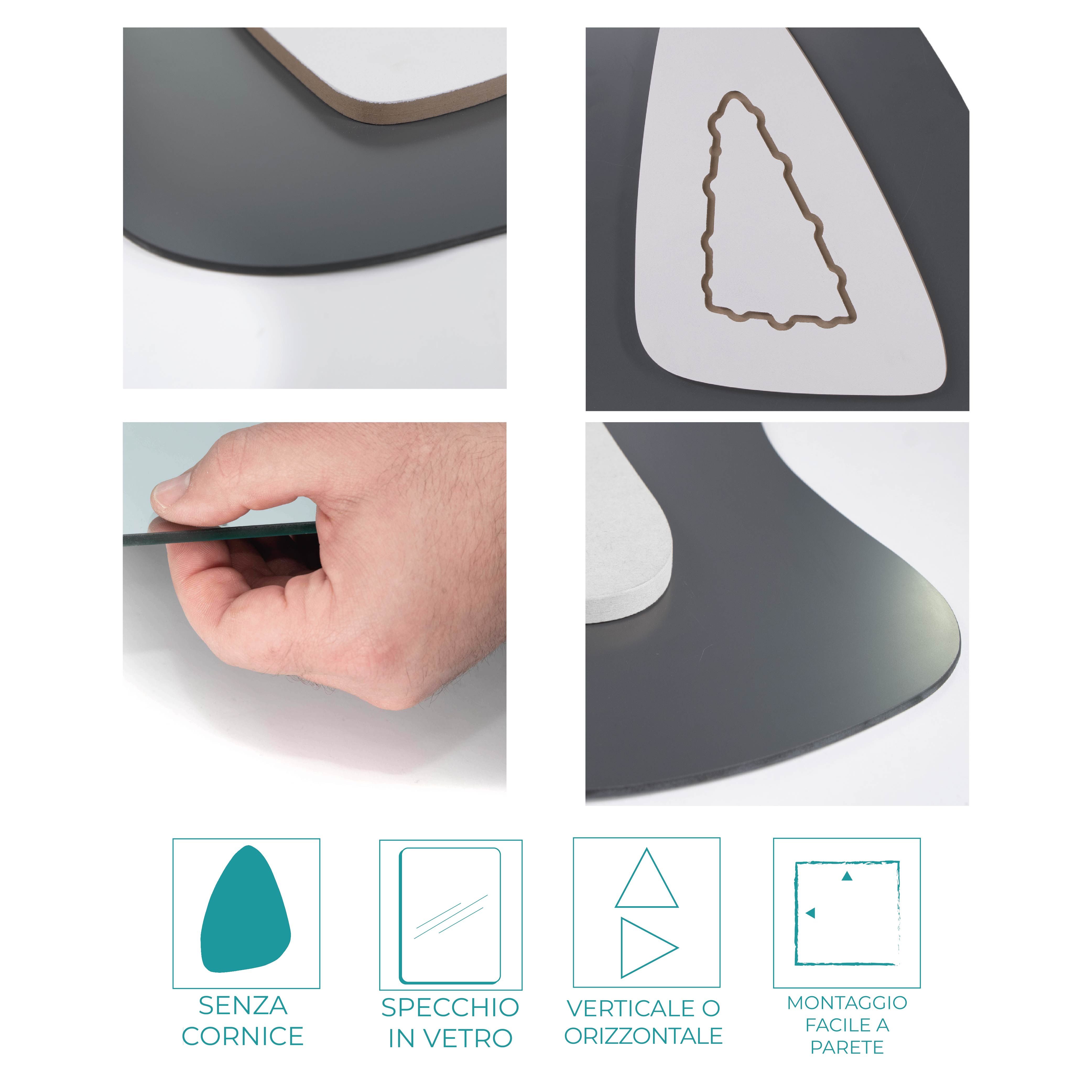 Entrambe le varianti sono realizzate in vetro cristallo di prima qualità, che garantisce una riflessione nitida e brillante. Il retro dello specchio è dotato di un pannello in MDF concavo, progettato per facilitare il fissaggio a parete. Grazie all’alloggiamento predisposto, puoi appenderlo con estrema facilità, regolando la posizione e l’inclinazione per adattarlo perfettamente alle tue esigenze.