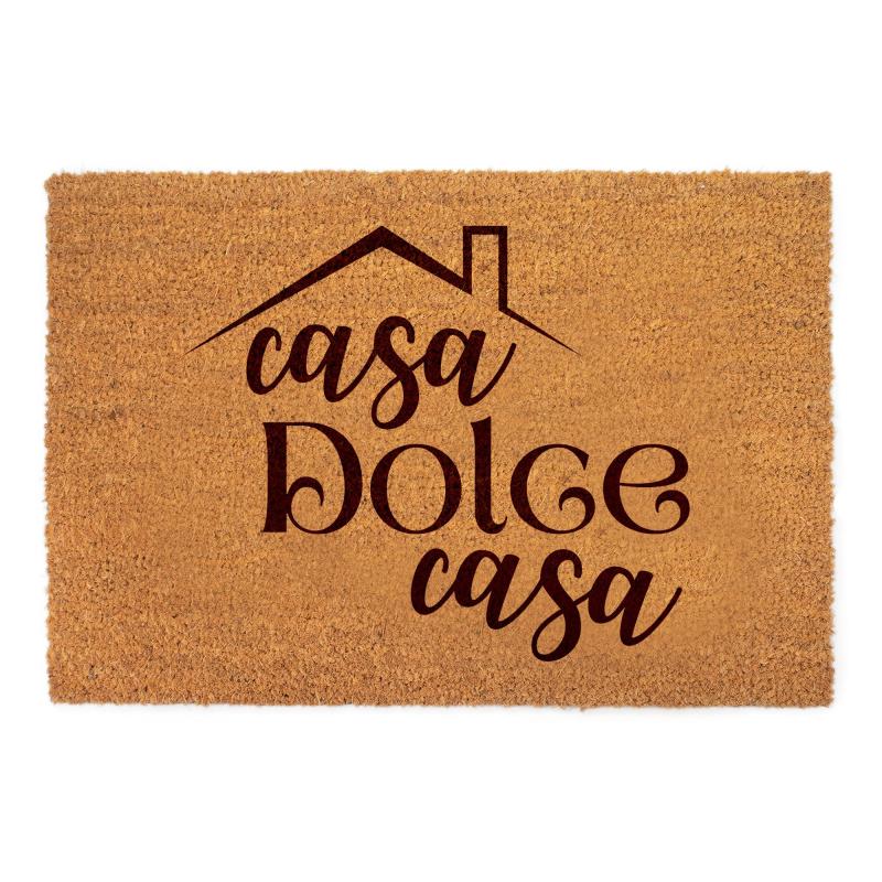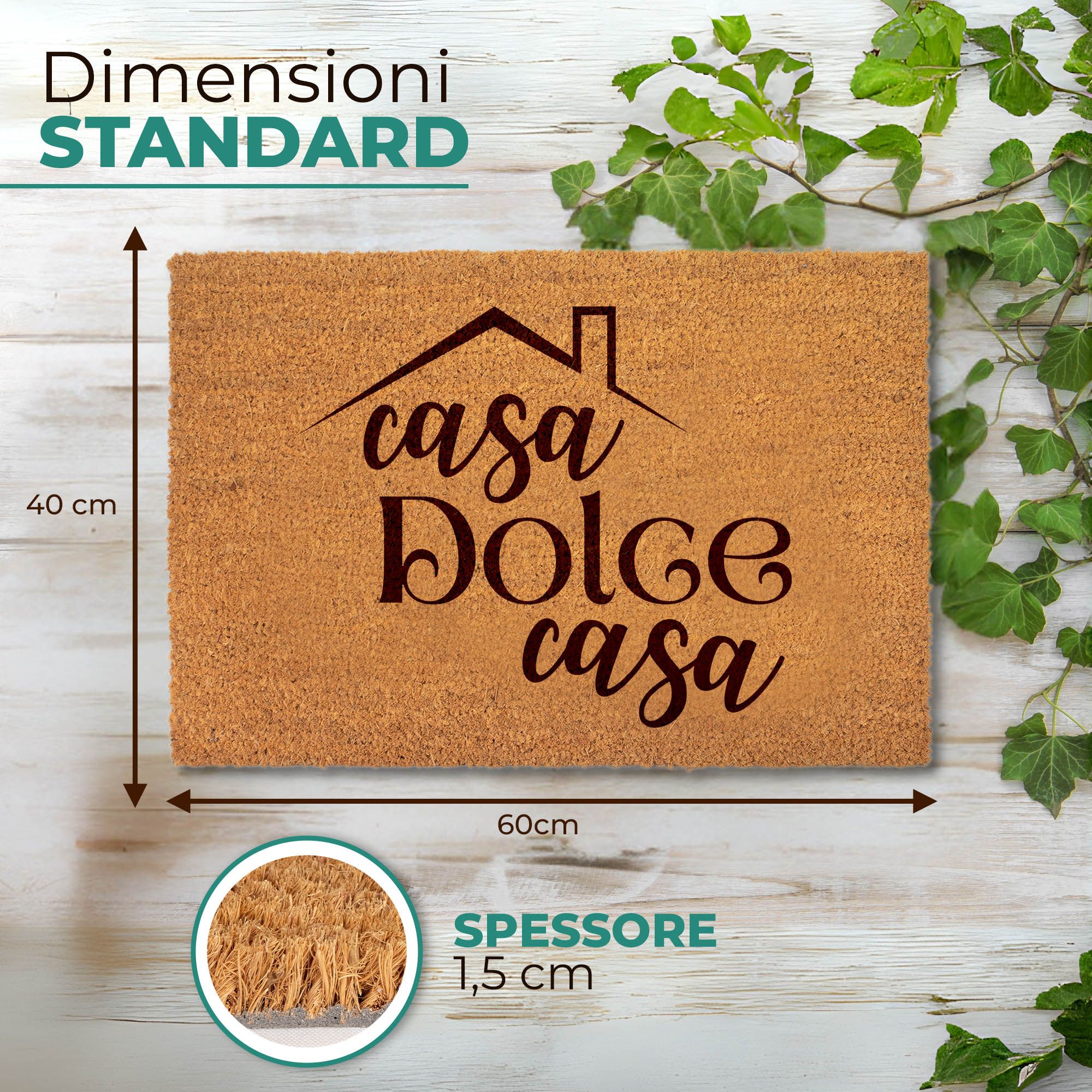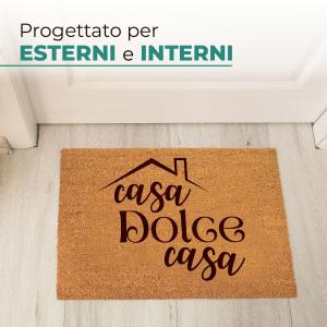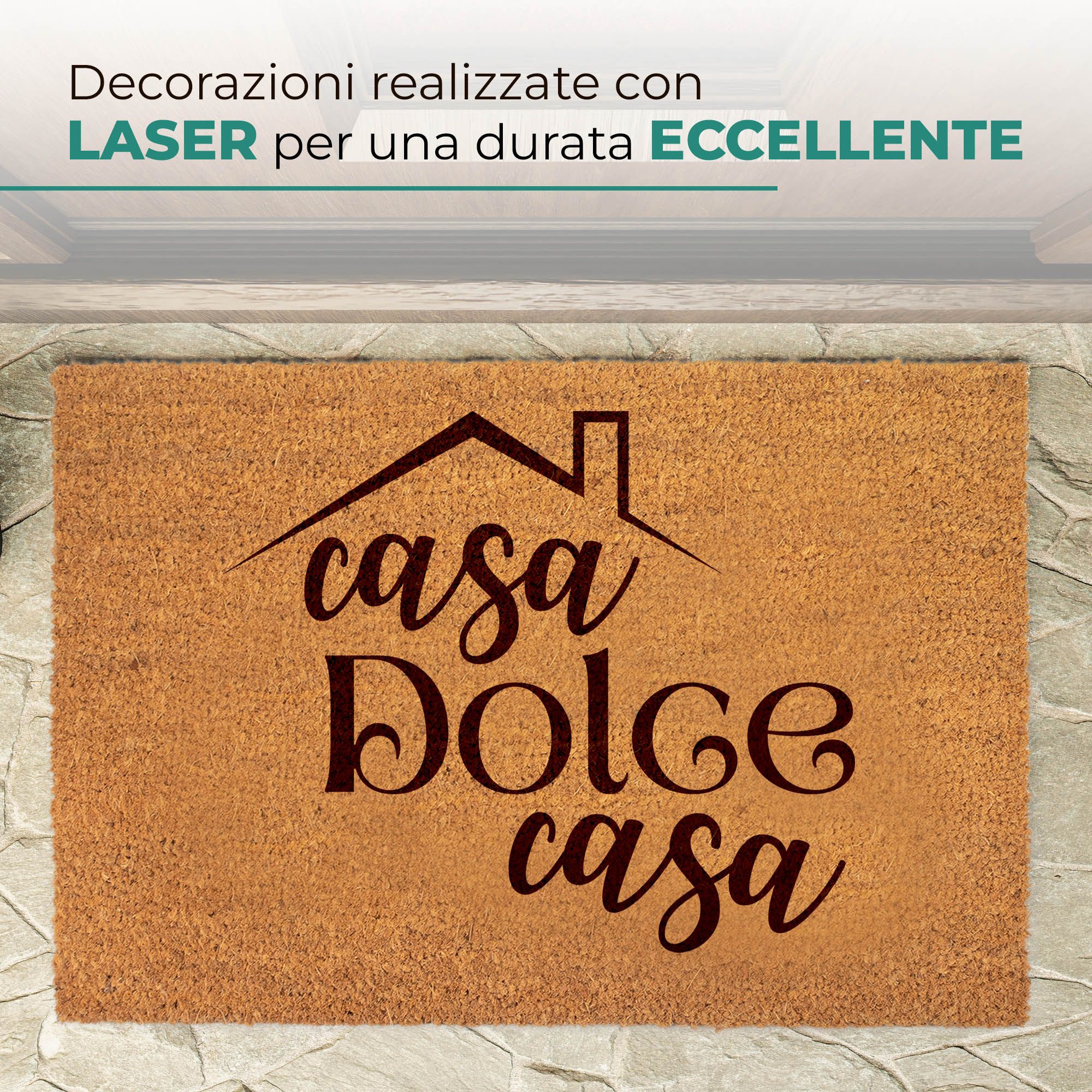 Trasforma il tuo ingresso in un biglietto da visita accogliente e funzionale con il nostro zerbino in fibra di cocco naturale 100% con retro antiscivolo in pvc. Il design è uno dei punti di forza: le decorazioni incise al laser, originali e permanenti con disegni e testi che rendono questo zerbino non solo un accessorio pratico, ma anche un complemento d’arredo che dona personalità e stile alla tua casa. Scegli tra grafiche moderne, fantasiose o classiche, pensate per sorprendere i tuoi visitatori con un messaggio di benvenuto sempre unico. Come la scritta classica “Casa dolce casa”: raffinata che trasmette calore e accoglienza.