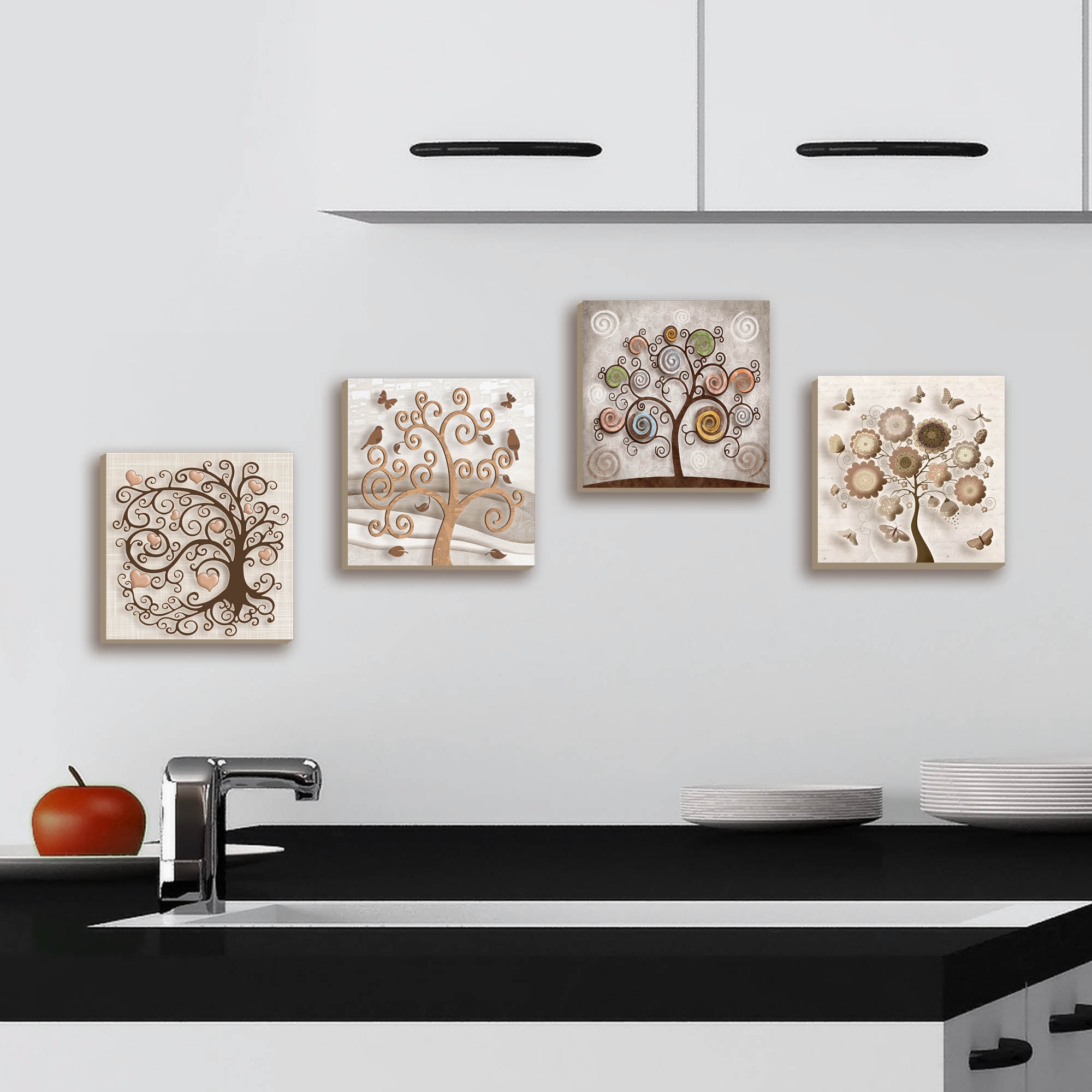 Il set è composto da 4 quadri separati caratterizzati da stampe con colori profondi e vividi con tema albero della vita che è diventato un simbolo di nascita e rinascita. Una nuova ed originale decorazione per parete che potrà rendere piacevole il tuo arredo. Abbellisci la tua cucina, la parete dietro al tuo divano, corridoio, ufficio, ingresso, bagno e dai spazio alla tua creatività.