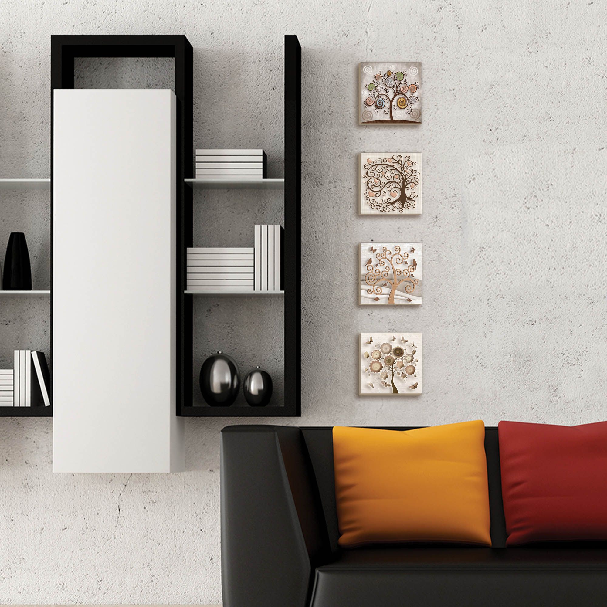 Il set di quadri moderni a tema albero della vita è composto da 4 quadretti nelle dimensioni 16x16 cm ciascuno. Ogni quadro è pronto da appendere con telaio in legno e tela con spessore di 3 cm, già montato, puoi appendere i 4 quadri come preferisci e nell'ordine che più ti piace per decorare la tua parete al meglio. Potrai scegliere se appenderli uno sotto l’altro, in fila in verticale o comporre un disegno sulla tua parete per un effetto di classe.