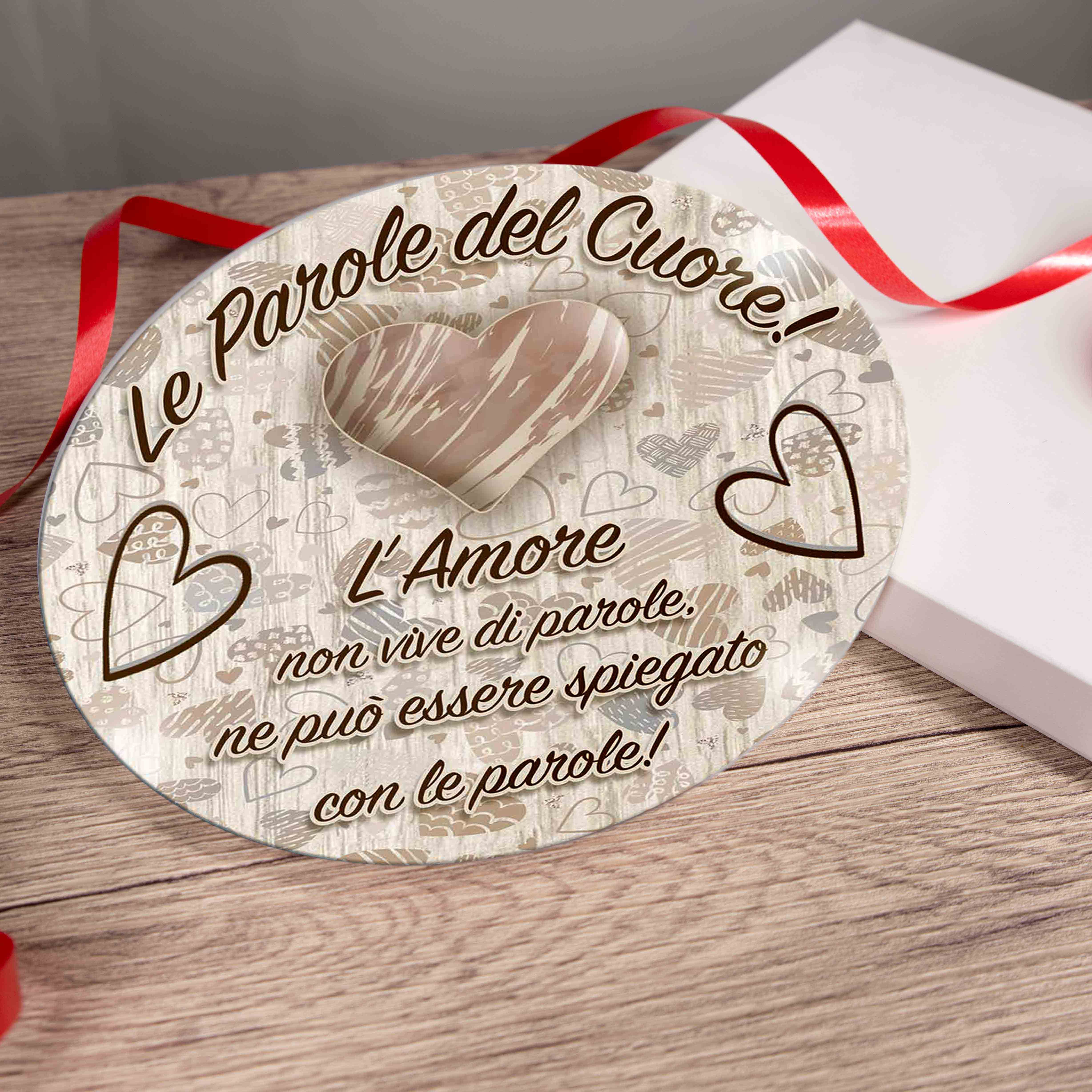 La nostra bomboniera Sottopentola con Vetro sulla zona di appoggio decorato con stampe a colori, in alta qualità con colori vividi con frase sul tema dell'amore. Il sotto pentola ideale da usare anche come decorazione grazie al foro sul retro per essere facilmente fissato al muro ha anche un utilissimo piede di appoggio in legno di 1 cm.