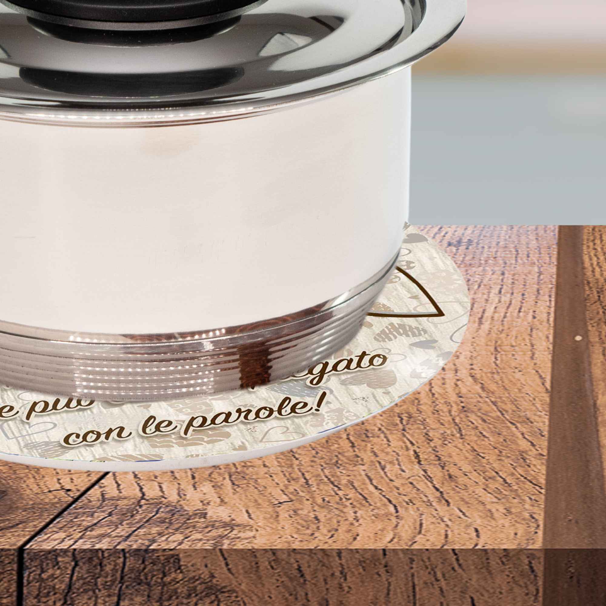 Da regalare in qualsiasi occasione ad amici o familiari, un dono per una persona speciale. Il sottopentola ha una dimensione di diametro di 21 cm con spessore di 1,5 cm, la confezione regalo comprende il Certificato di Garanzia all’interno della scatola bianca inclusa con dimensioni 22x22x2,5 cm