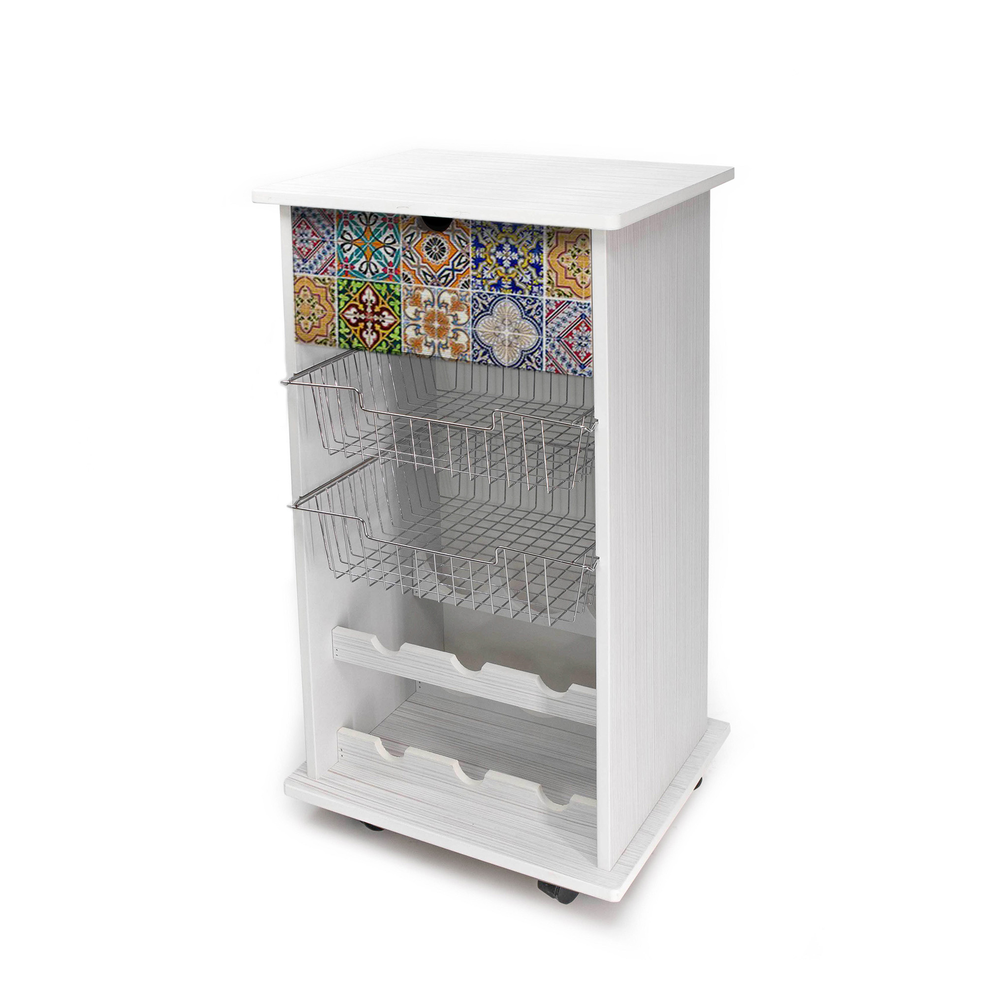 Il nostro Carrello NEW Portafrutta in fibra di Legno e’ un pratico carrello trasportabile multiuso da cucina o per altri ambienti anche non domestici con portabottiglie, con in dotazione 4 ruote piroettanti per un facile spostamento. Il carrello e’ gia' montato e pronto all'uso ed ha un particolare Decoro unico e originale stampato sul Cassetto con anta ribaltabile per pane o per ogni esigenza, dalle dimensioni interne di 38 cm come larghezza frontale, 29 cm profondità e altezza 16 cm. Nella parte superiore troverai un piano di appoggio dalle molteplici funzioni con larghezza di 47 cm e profondità 39 cm. Inoltre viene fornito con 2 pratici e fondamentali Cestelli in acciaio estraibili con larghezza frontale 33 cm, profondità 36 cm, altezza 9 cm e 2 ripiani porta bottiglie cantinetta. Grazie ai ripiani porta bottiglie e’ possibile alloggiare all’interno del carrello 6 Bottiglie. Il peso totale del prodotto e' di 14kg che garantiscono robustezza e resistenza al carrello in fibra di legno. Le dimensioni totali del prodotto sono: larghezza frontale 47 cm, profondità 39 cm e altezza totale di 85 cm.