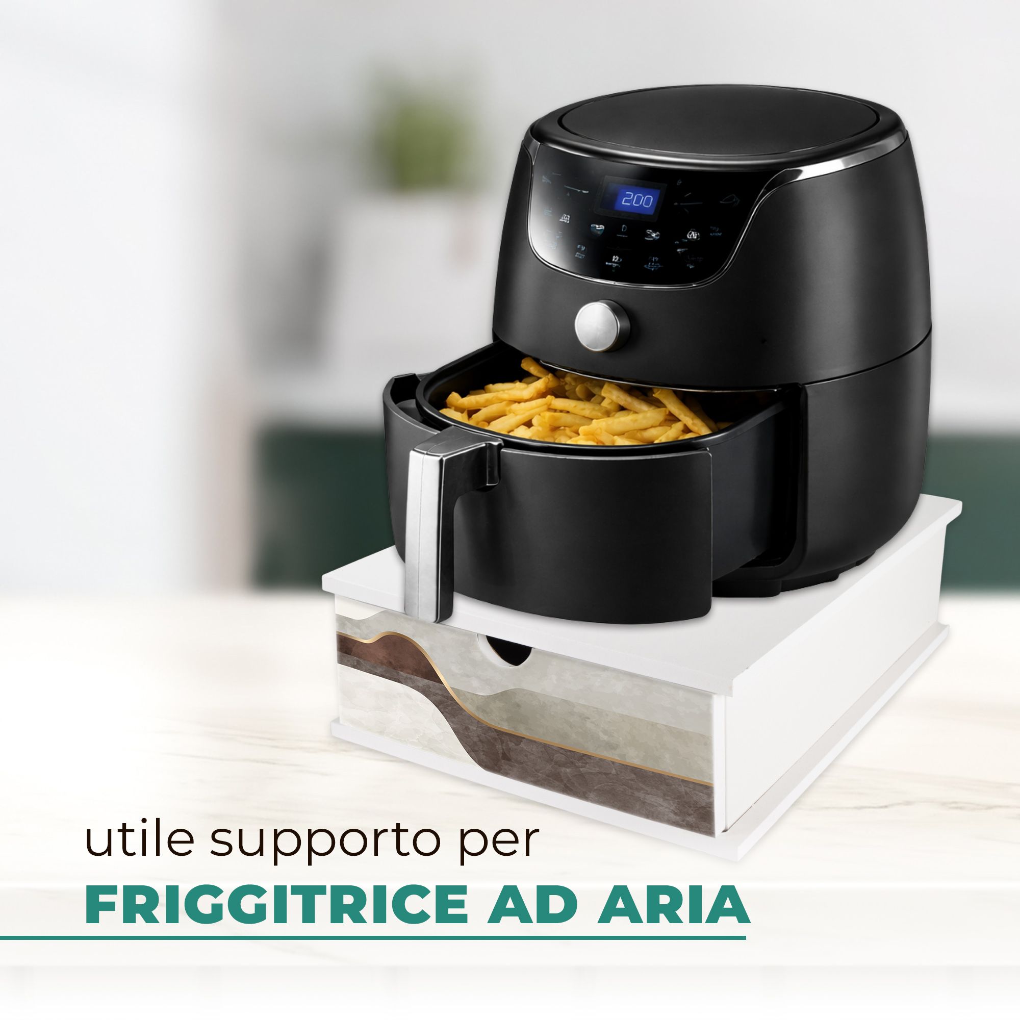 Il piano superiore robusto e stabile può sostenere macchine da caffè dei principali brand come Lavazza, Nespresso, De’Longhi, Bialetti, Borbone, Ariete, oltre a friggitrici ad aria compatte, robot da cucina e altri piccoli elettrodomestici, trasformando qualsiasi spazio in un angolo bar funzionale e ordinato.