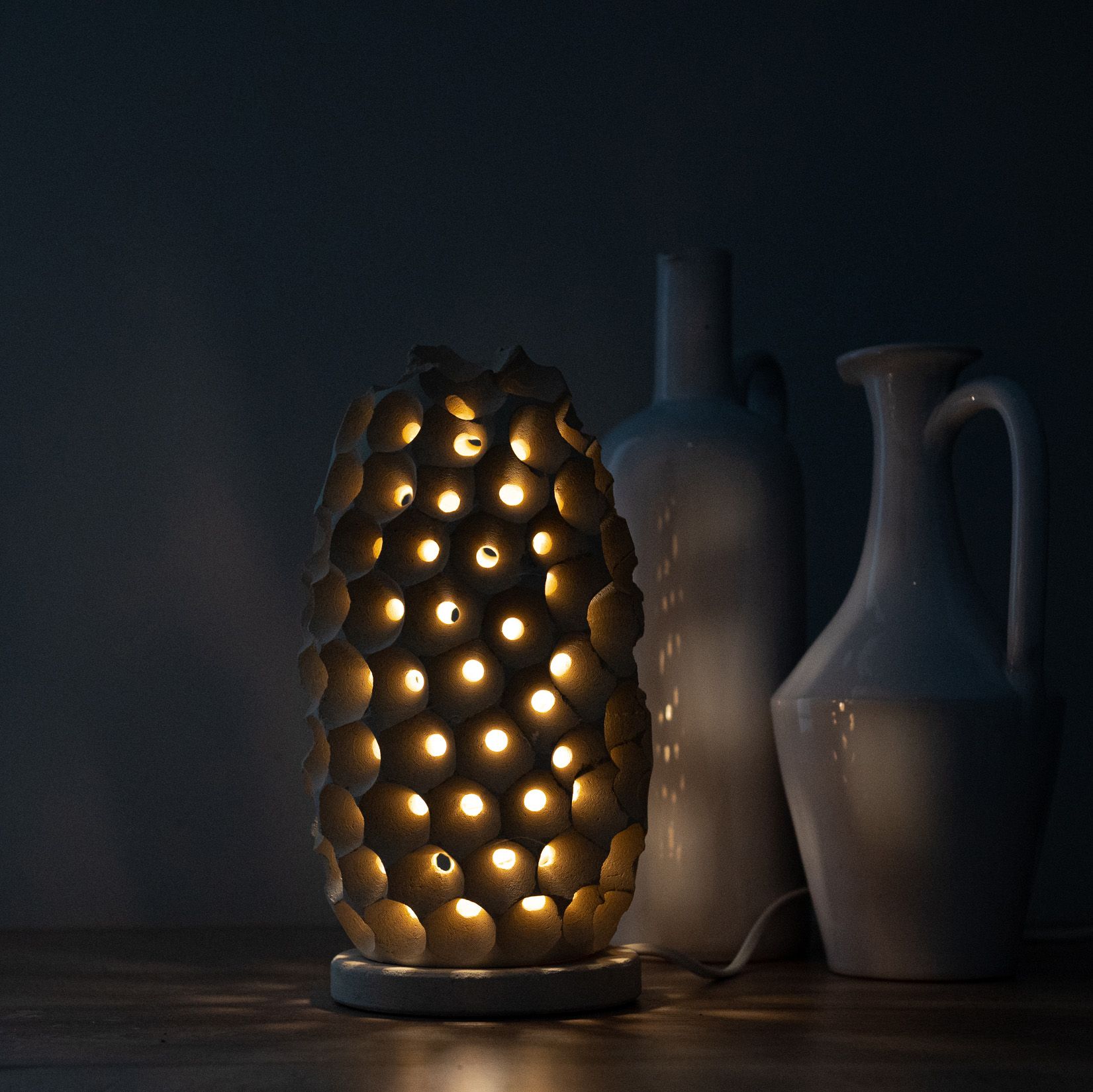 Arricchisci la tua casa con questa bellissima Lampada da tavolo a forma di pigna, una scultura realizzata artigianalmente nel Salento in pietra leccese. Si adatta a tutti gli ambienti sia moderni che classici. Completamente realizzata a mano e unica nel suo genere lavorata dai maestri d'arte leccesi. Ottima come idea regalo, per Comunione, Battesimo, Matrimonio o altri eventi. La pietra Leccese o 'leccisu' in Salentino è una pietra calcarea risalente cira a 21 milioni di anni fa dai colori e strutture unici. L'articolo giusto per rinnovare e arredare la tua casa. Adatto per qualsiasi ambiente di casa come soggiorno, sala da pranzo, camera da letto o per ambiente lavorativo, interno ed esterno. Il classico interruttore sul filo permette di accendere e spegnere facilmente la lampada da tavolo. È necessaria una lampadina con attacco piccolo E14 non inclusa nella confezione. Una sorgente luminosa di alta qualita' caratterizzata da un particolare effetto decorativo grazie alla lavorazione della pietra.