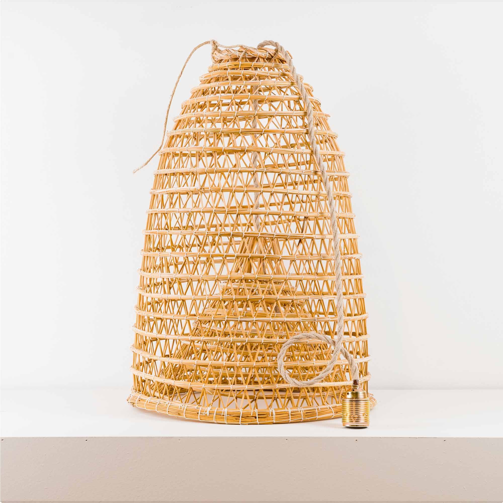 Ogni lampada è realizzata a mano dal maestro salentino Felice, rendendolo ogni pezzo unico e originale che trasforma il giunco raccolto nelle campagne Salentine in oggetti di arredamento e design, la nassa tipicamente usata dai pescatori nei fondali del mare viene rivisitata e si trasforma in un oggetto di design e arredamento da collocare anche sul pavimento.