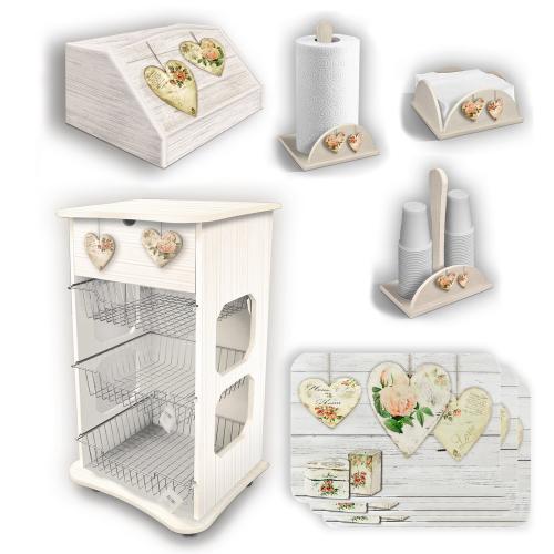 Ogni set di cucina shabby è realizzato con legno di alta qualità, selezionato per la sua resistenza e bellezza naturale, e trattato con vernici atossiche per garantire la sicurezza alimentare e durabilità nel tempo. Questi accessori non solo sono funzionali, ma oltre a donare autenticità alla vostra cucina, si integrano perfettamente con l'arredamento.