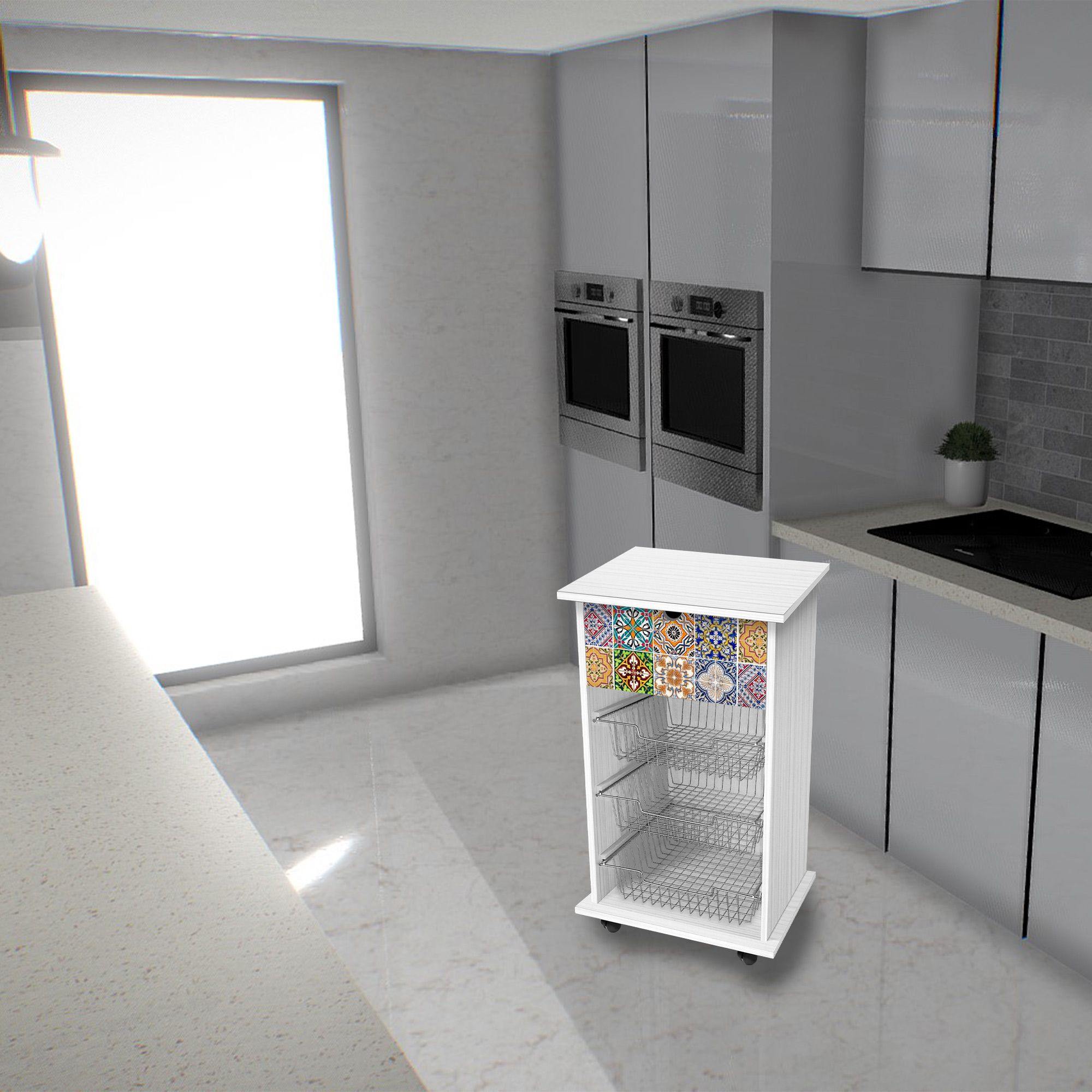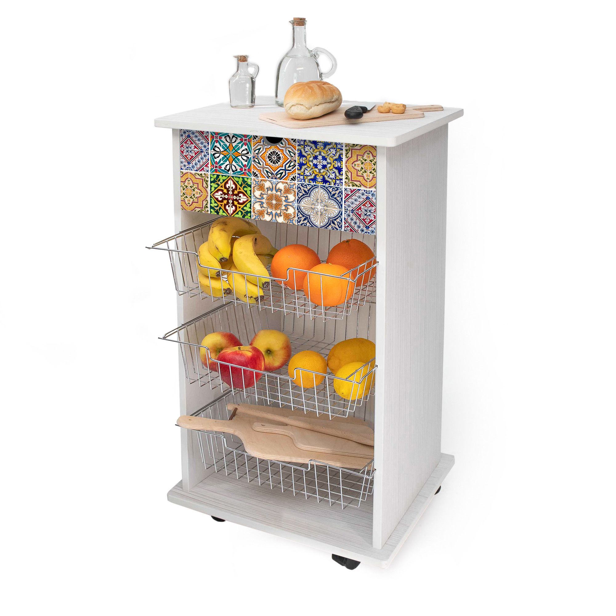 Lupia - Carrello Cucina Multifunzione Bianco WHITE TILES, Portafrutta Ruote Piroettanti, Piano di Appoggio, tre Cestelli Estraibili in Acciaio, Legno 40X45H85 cm montato -
