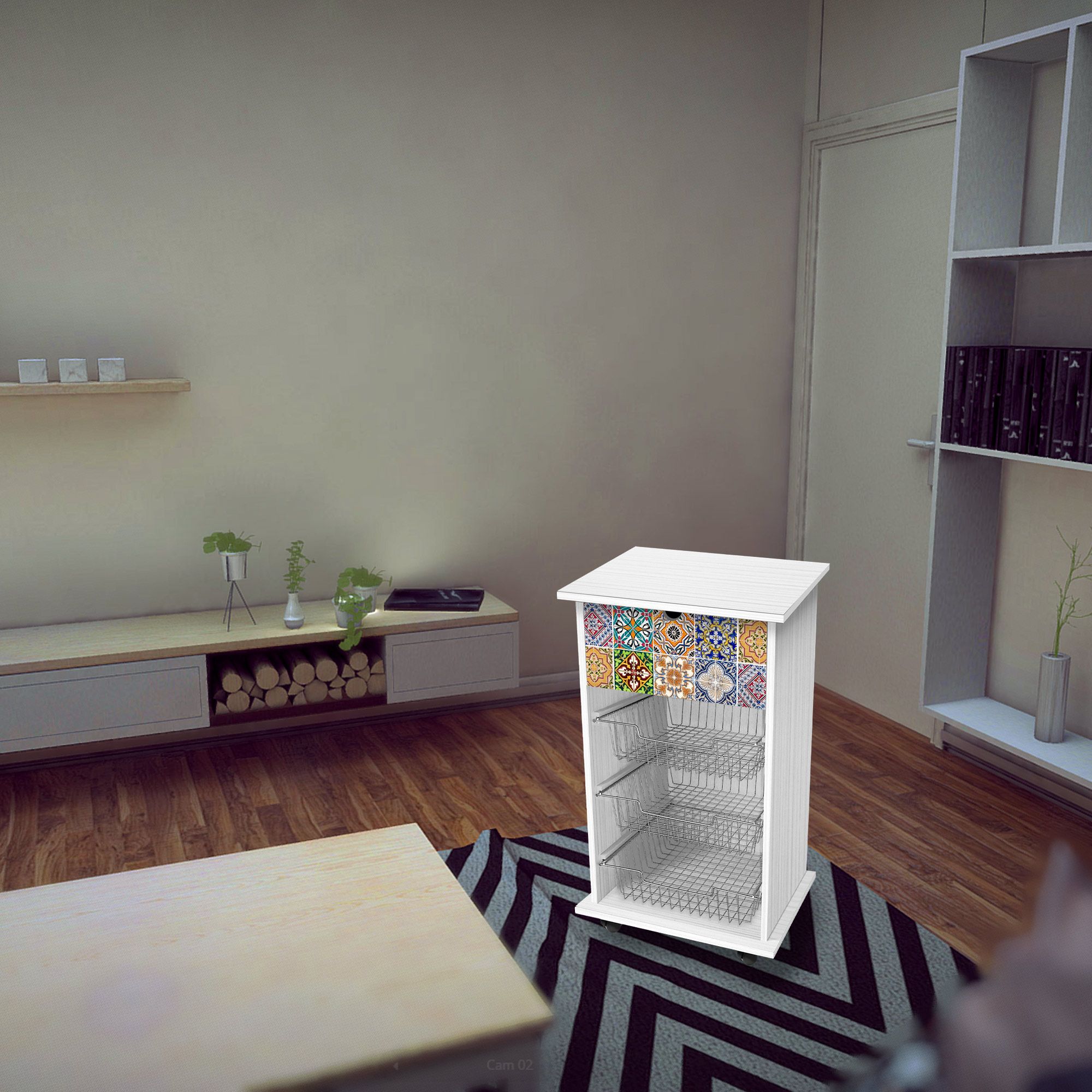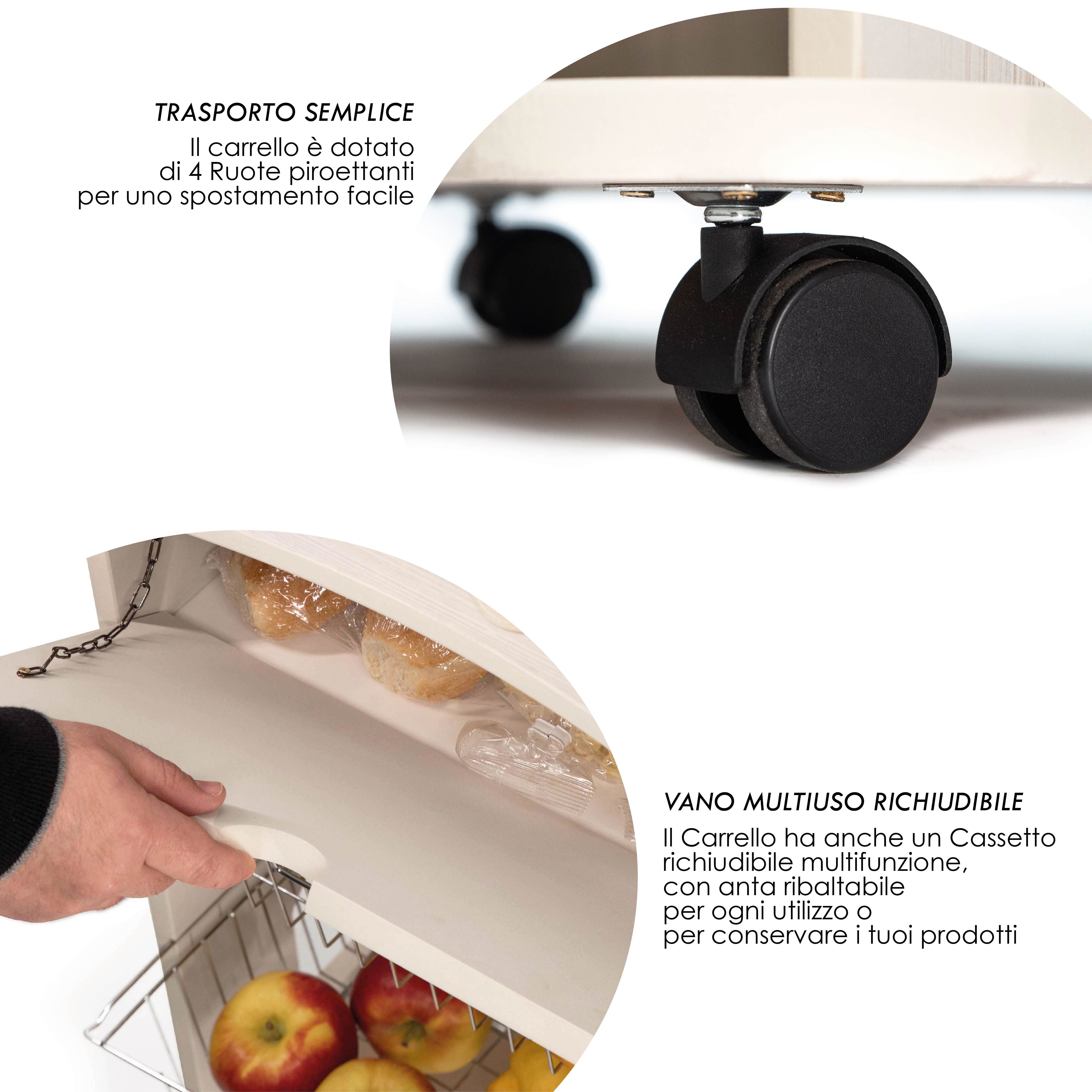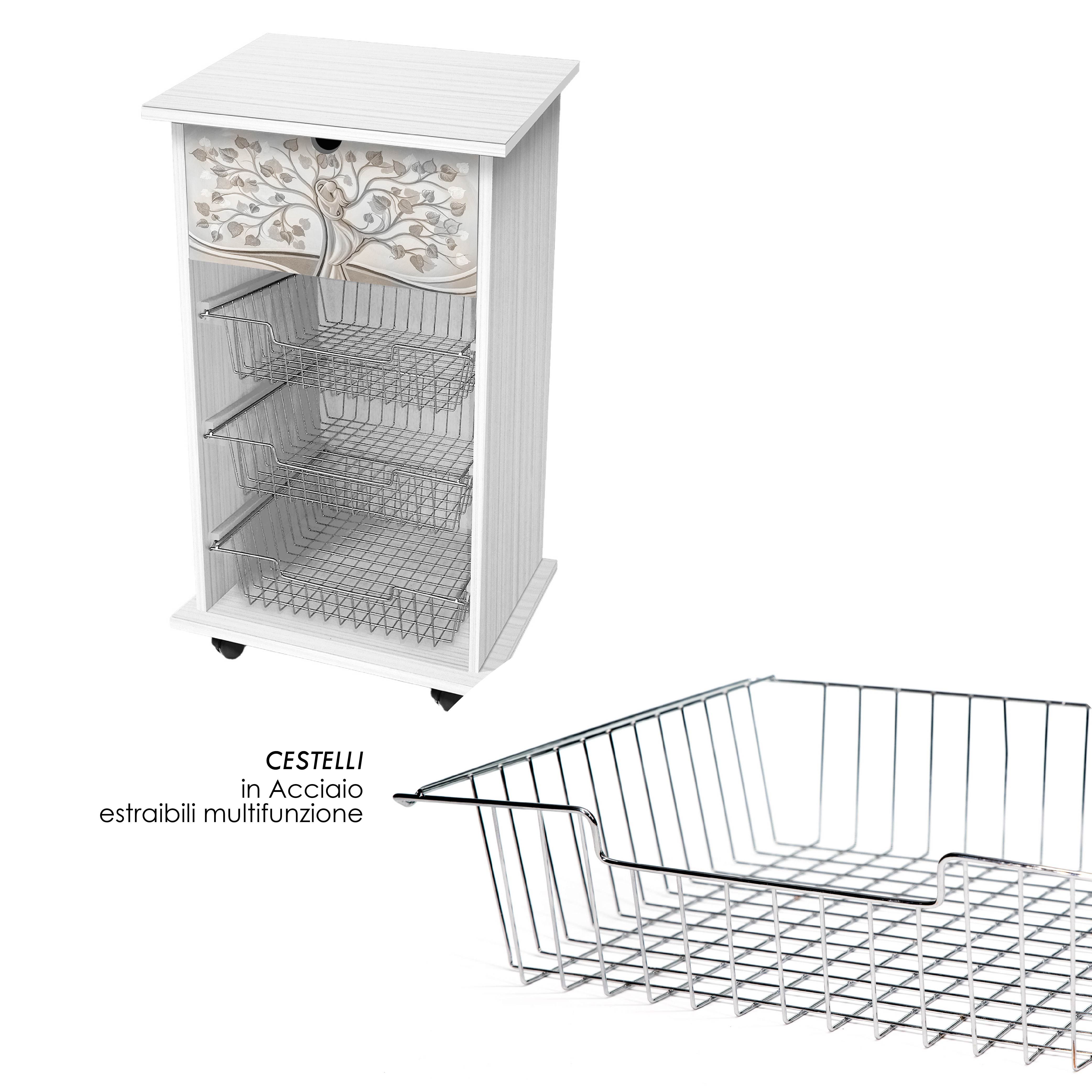 Il piano di appoggio superiore e i tre cestelli in acciaio estraibili offrono ampio spazio per organizzare frutta, verdura e altro, mentre il cassetto con anta ribaltabile, decorato con motivi, si rivela perfetto per conservare pane o qualsiasi altra necessità , aggiungendo un tocco di stile inconfondibile.