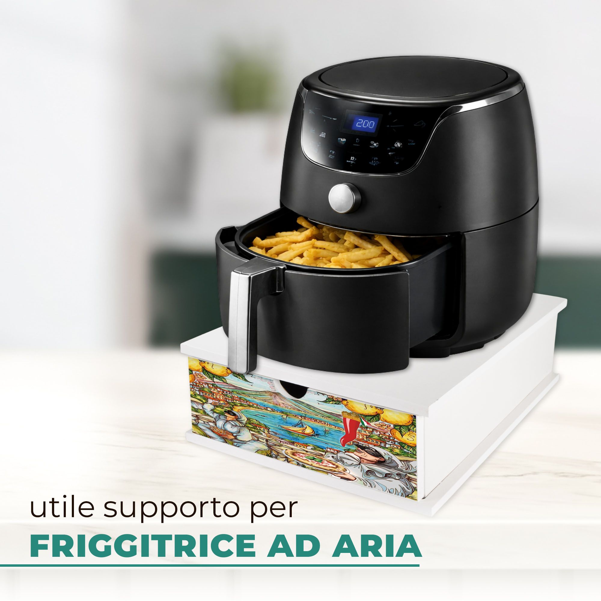 Il piano superiore robusto e stabile può sostenere macchine da caffè dei principali brand come Lavazza, Nespresso, De’Longhi, Bialetti, Borbone, Ariete, oltre a friggitrici ad aria compatte, robot da cucina e altri piccoli elettrodomestici, trasformando qualsiasi spazio in un angolo bar funzionale e ordinato.