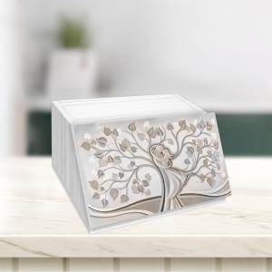 Il portapane White Albero Abbraccio della collezione Lupia è un complemento essenziale per chi desidera combinare praticità e stile nell'organizzazione della propria cucina. Non solo offre un’ottima soluzione per la conservazione del pane, ma si distingue anche come oggetto decorativo, perfetto per arricchire l'estetica della cucina. Realizzato in fibra di legno, il portapane White presenta nella parte frontale dello scomparto apribile una dolce illustrazione: un albero in fiore che avvolge teneramente una coppia di innamorati in un caloroso abbraccio. I colori utilizzati sono tenui e raffinati, spaziando dal bianco panna al grigio e marrone chiaro, creando un delicato contrasto di chiaroscuri che esalta la bellezza delle forme e delle sagome presenti.