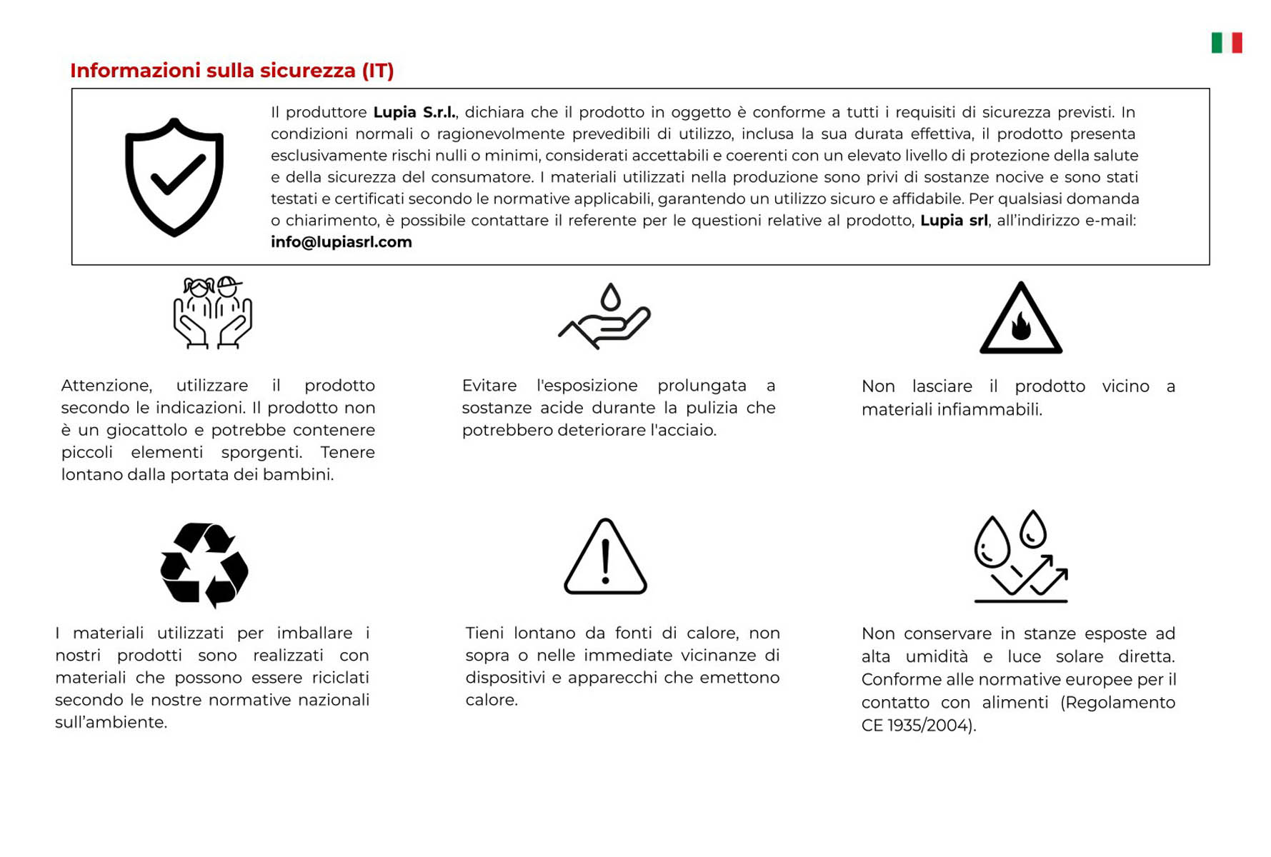 Vorreishop si impegna, per ogni prodotto venduto, a offrire schede di sicurezza e manuali utente dettagliati, nel pieno rispetto della normativa europea GPSR, garantendo che tutti i prodotti siano conformi agli standard di sicurezza richiesti. Puoi accedere e scaricare le immagini di sicurezza e il manuale utente nella sezione dedicata "Risorse per la sicurezza" presente su questa pagina. Per maggiori informazioni visita Condizioni Generali di Vendita